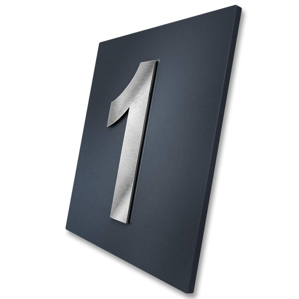 Hausnummernschild in Anthrazit mit aufgesetzter Edelstahlziffer für 3D-Effekt