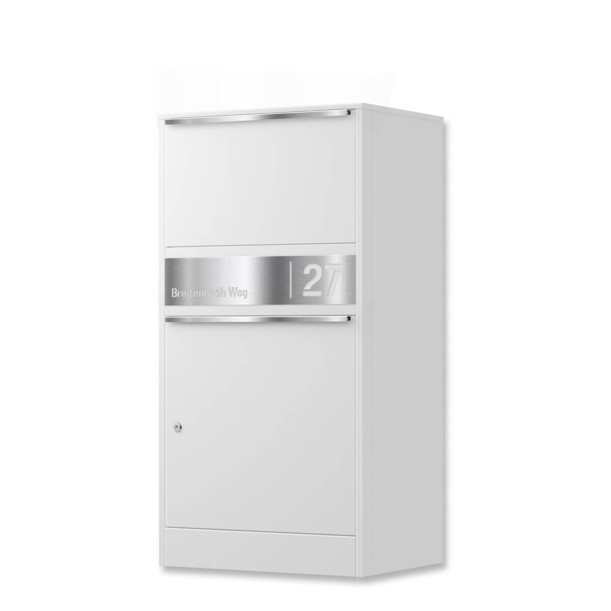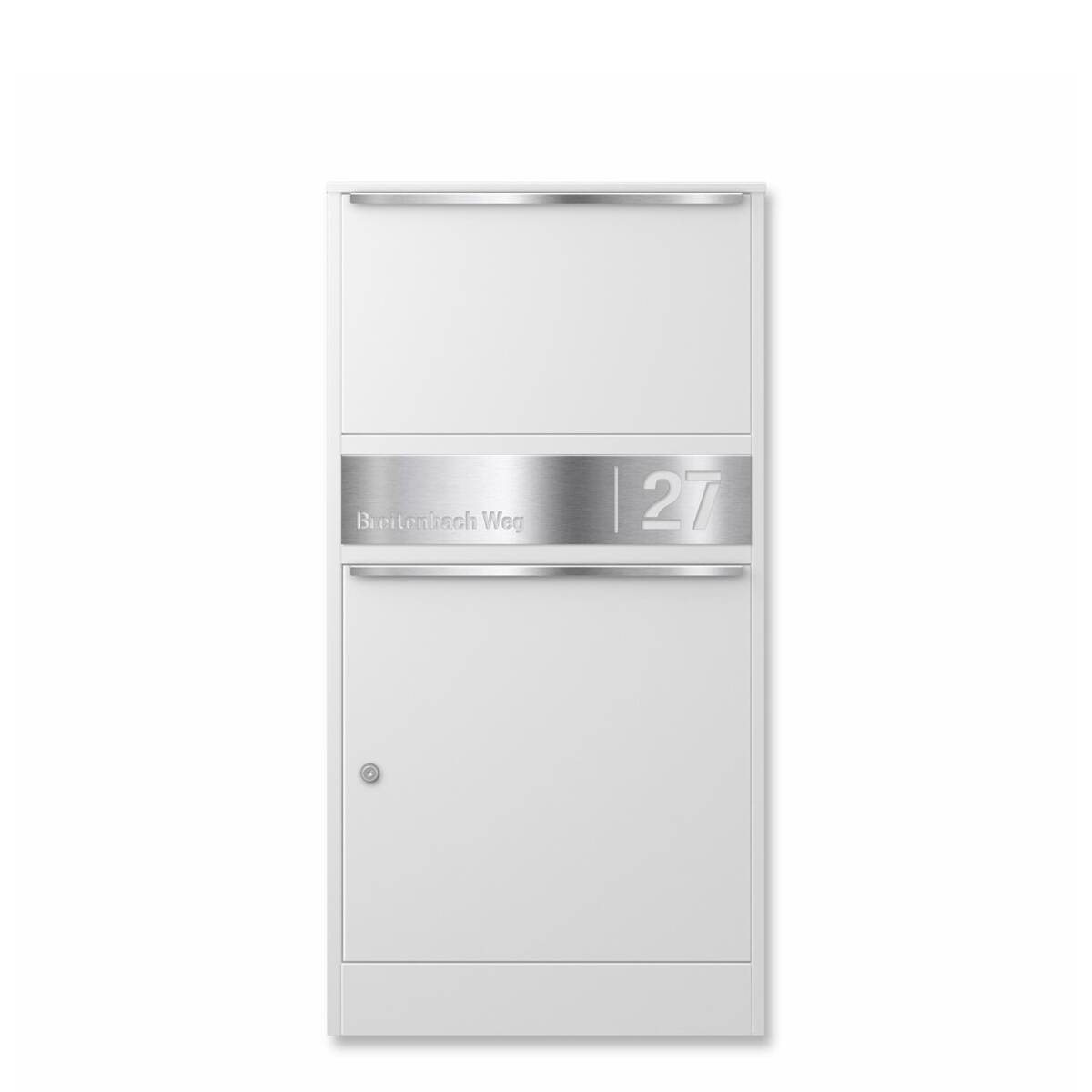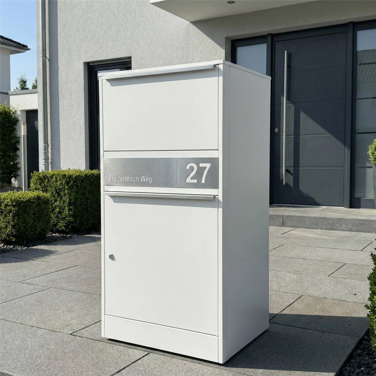 Ihre Adresse wird präzise aus einer Edelstahlplatte ausgelasert und sorgt so für eine klare und langlebige Personalisierung. Die pulverbeschichtete Oberfläche in RAL 9016 Verkehrsweiß ist rostfrei, pflegeleicht und für den dauerhaften Einsatz im Außenbereich geeignet.