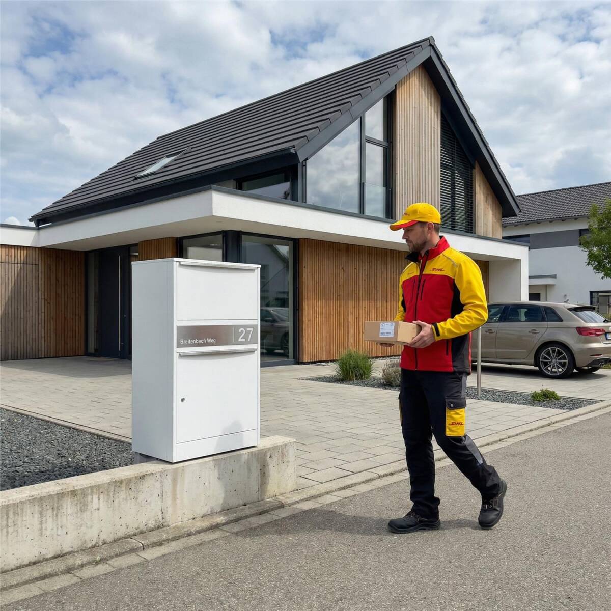 Die Paketbox ermöglicht den sicheren und kontaktlosen Empfang von Paketen zu jeder Zeit – auch bei Abwesenheit. Nach dem Einwurf werden Paketsendungen zuverlässig im Inneren verwahrt und sind vor unbefugtem Zugriff geschützt.