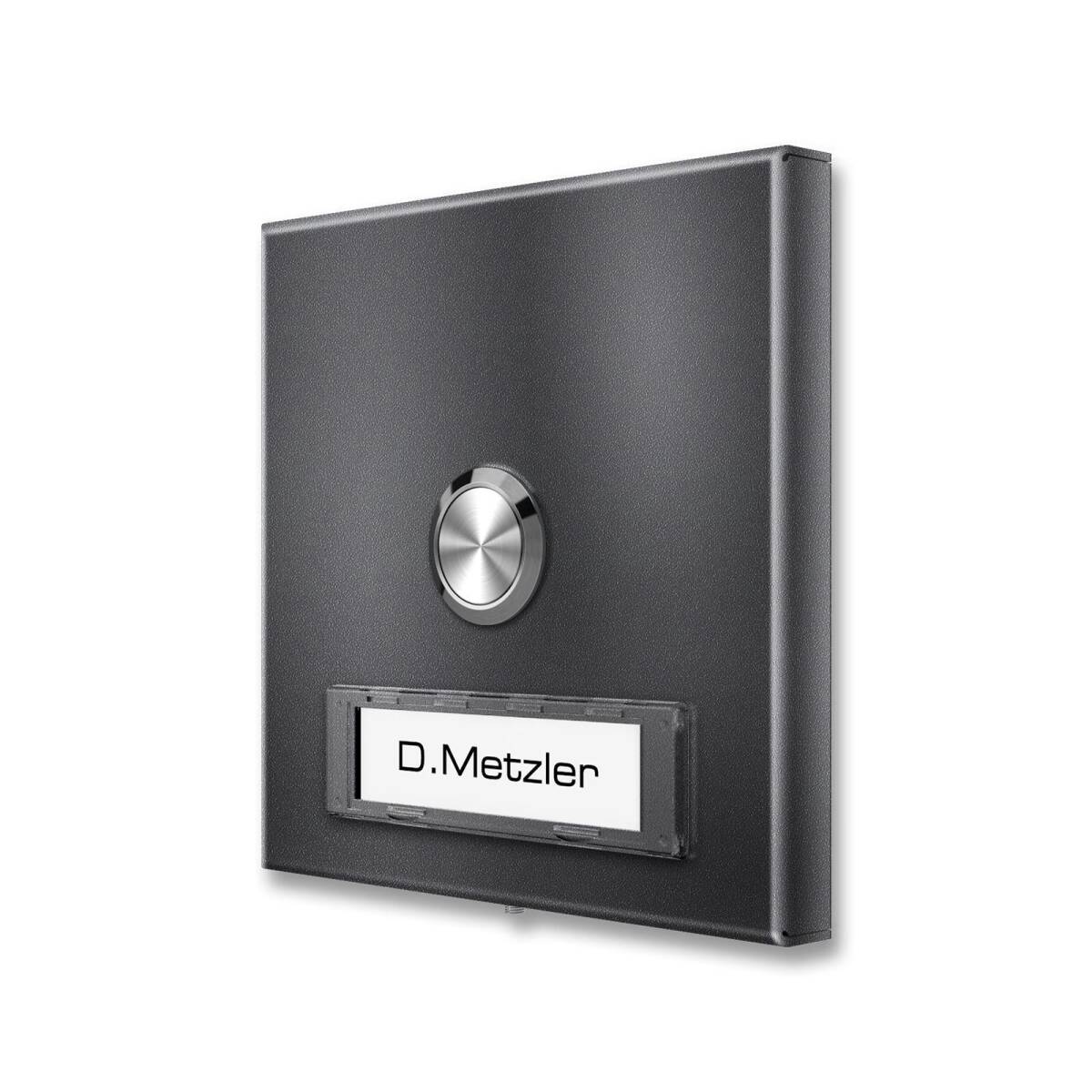 Allora questa placca campanello massiccia è esattamente ciò che fa per voi. Grazie all'acciaio inox inossidabile con ulteriore rivestimento a polvere nel colore effetto ferro micaceo DB 703, la placca è assolutamente resistente alle intemperie e appare come nuova anche dopo anni. La pratica targa del nome di Renz è intercambiabile in qualsiasi momento in caso di modifica.