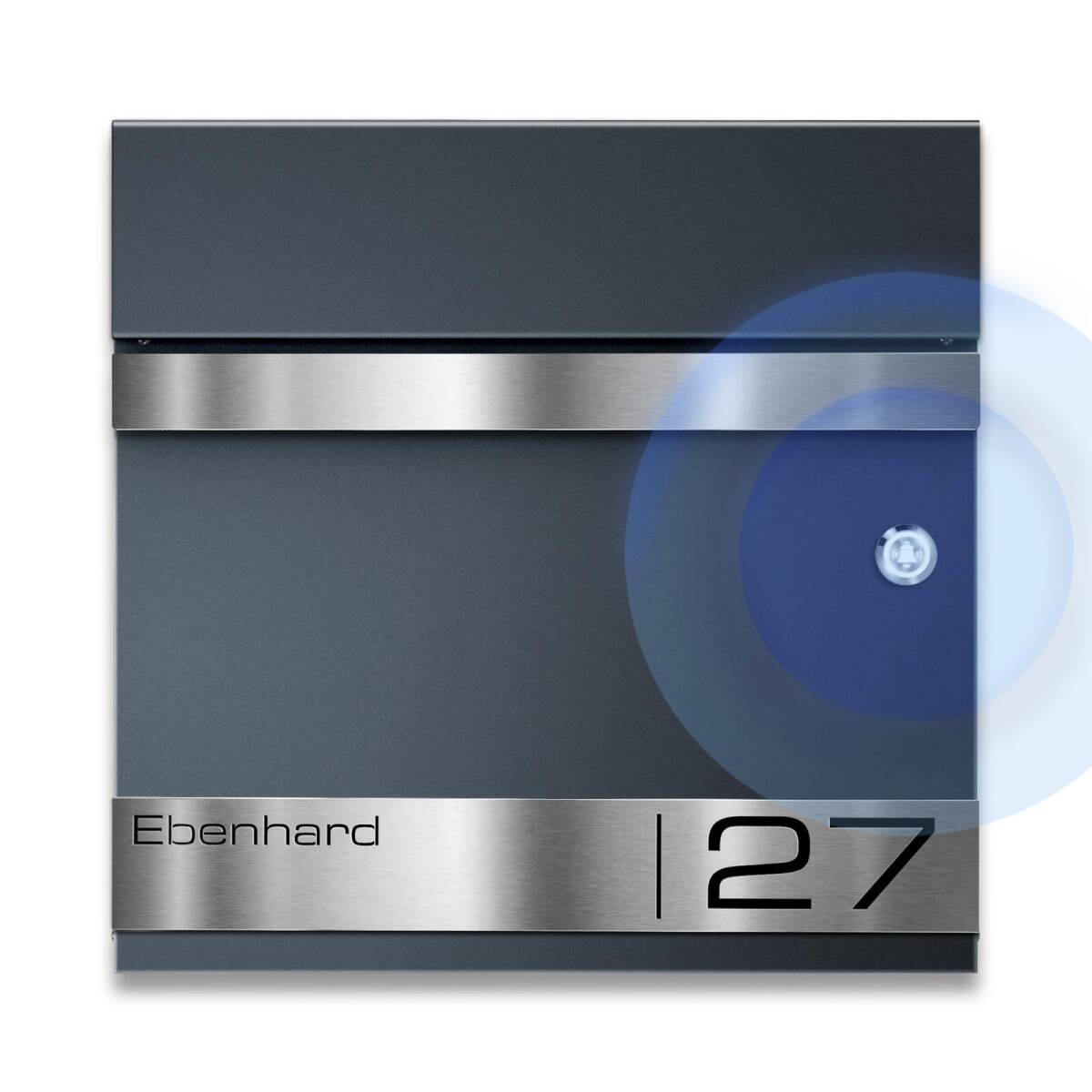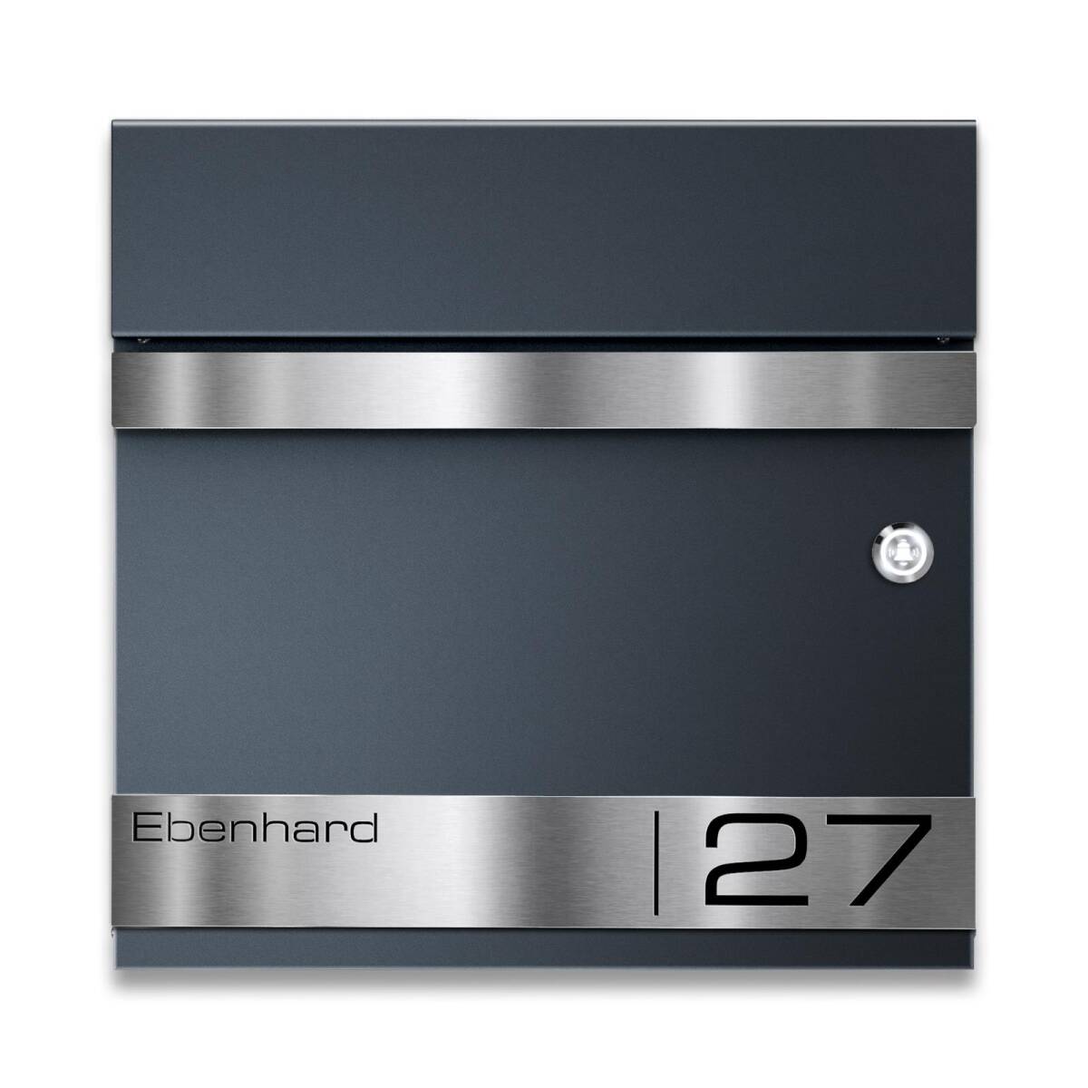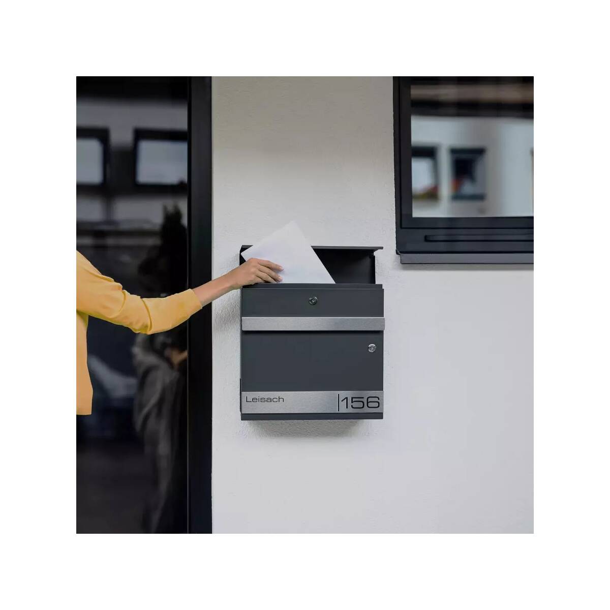 L'esclusiva cassetta delle lettere è verniciata a polvere in RAL 7016 Antracite. La placca frontale è realizzata in acciaio inox spazzolato e offre un contrasto ideale. Per l'incisione laser personalizzata puoi scegliere tra diversi stili di carattere, per personalizzare ulteriormente la tua cassetta delle lettere. La cassetta delle lettere ha una fessura di inserimento generosa di 335 x 35 mm, permettendo di inserire senza problemi anche grandi spedizioni. La serratura della cassetta delle lettere si trova protetta sotto la linguetta di inserimento. Anche il vano per giornali è completamente integrato e protetto dalla pioggia.
