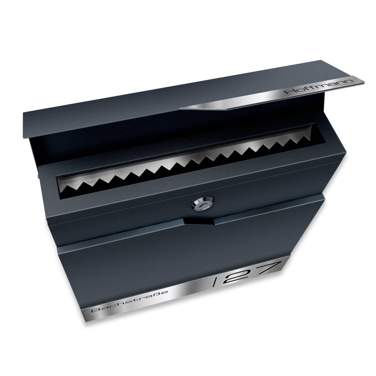 Hinweis: Bei eingebauter Entnahmesicherung wird der Briefkasten Schlitz nicht schmaler – der Einwurf Winkel ändert sich lediglich leicht.