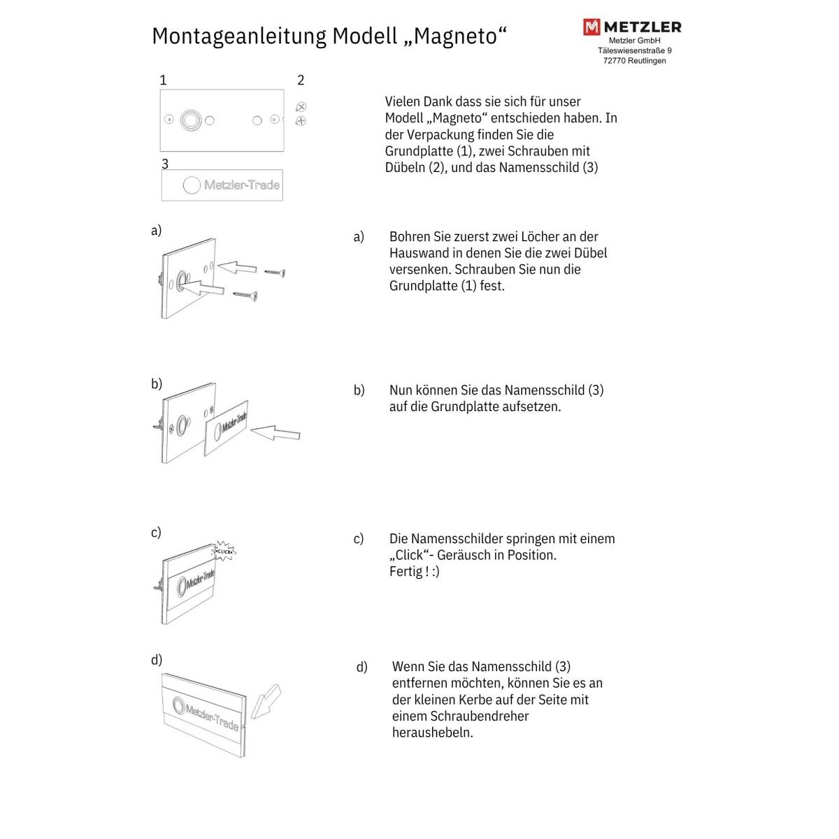 Mit der Türklingel und dem austauschbaren Namensschild Magneto sind Sie stets flexibel. Die Namensschilder haften magnetisch und sind somit jederzeit austauschbar. Für den Austausch benötigen Sie lediglich ein spitzes Werkzeug (Schraubenzieher o.ä.)