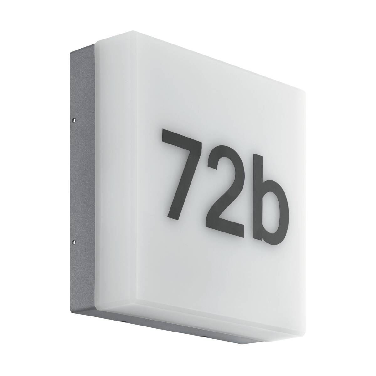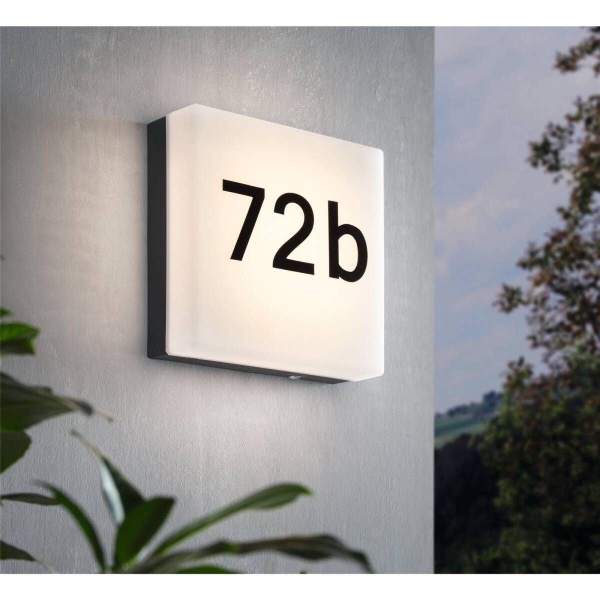 Die LED Außen-Wandleuchte CORNALE ist aus Kunststoff in Anthrazit mit einer quadratischen, weißen Kunststoff-Leuchtfläche gefertigt. Die zeitlose und praktische Hausnummernleuchte wird mit selbstklebenden, anthrazitfarbenen Buchstaben und Zahlen geliefert. Im Lieferumfang enthalten sind 1 x die Buchstaben a-f und 3 x die Zahlen 0-8 (die 6 kann selbstverständlich auch als 9 verwendet werden). Durch die angestrahlten Zahlen, lässt sich die Hausnummer auch aus der Ferne besonders gut lesen. Die integrierten LEDs spenden angenehmes, warmweißes Licht. Der verbaute Day & Night Sensor schaltet das Licht bei Abenddämmerung dauerhaft ein- und bei Tagesanbruch wieder aus. Die Leuchte ist spritzwassergeschützt (IP44) und ermöglicht einen bedenkenlosen Einsatz im Außenbereich. Dank des reduzierten Designs fügt sie sich in jeden modernen Outdoor-Bereich ein.