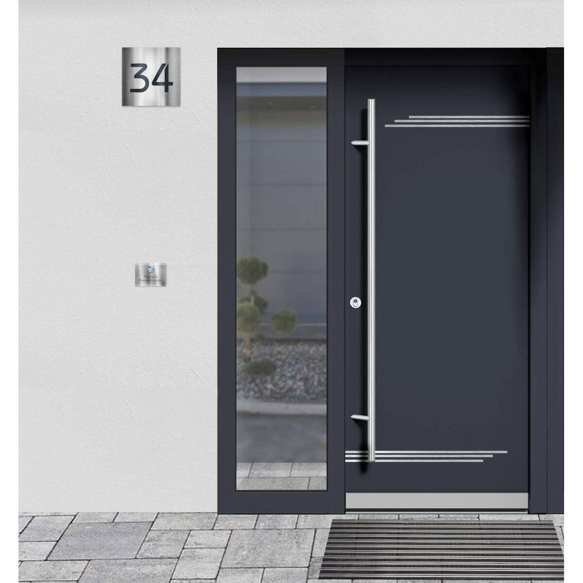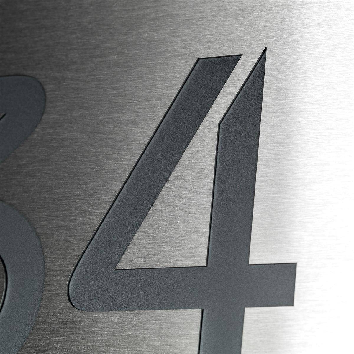 Dieses moderne Hausnummernschild ist ein hochwertiger Blickfang für Ihren Hauseingang. Die Tafel besteht aus lasergeschnittenem, rostfreiem Edelstahl, der mit speziellem, kratzfestem Acrylglas in der Farbe Anthrazit RAL 7016 hinterlegt ist. Die kontrastreiche Kombination von grob geschliffenem, rostfreiem Edelstahl V2A und einem anthrazitgrauen Hintergrund begeistert nicht nur auf den ersten Blick. Das Material ist außerdem extrem witterungsresistent und weist so eine sehr lange Lebensdauer auf.