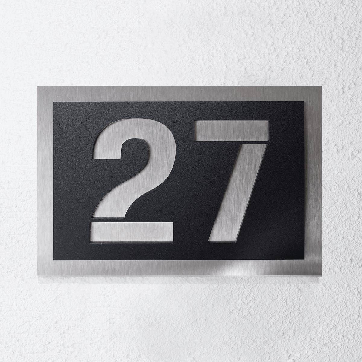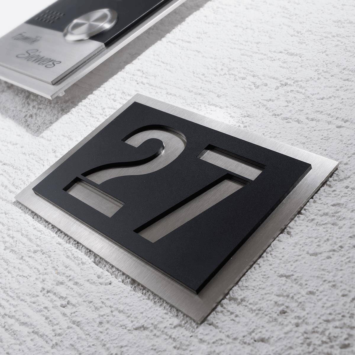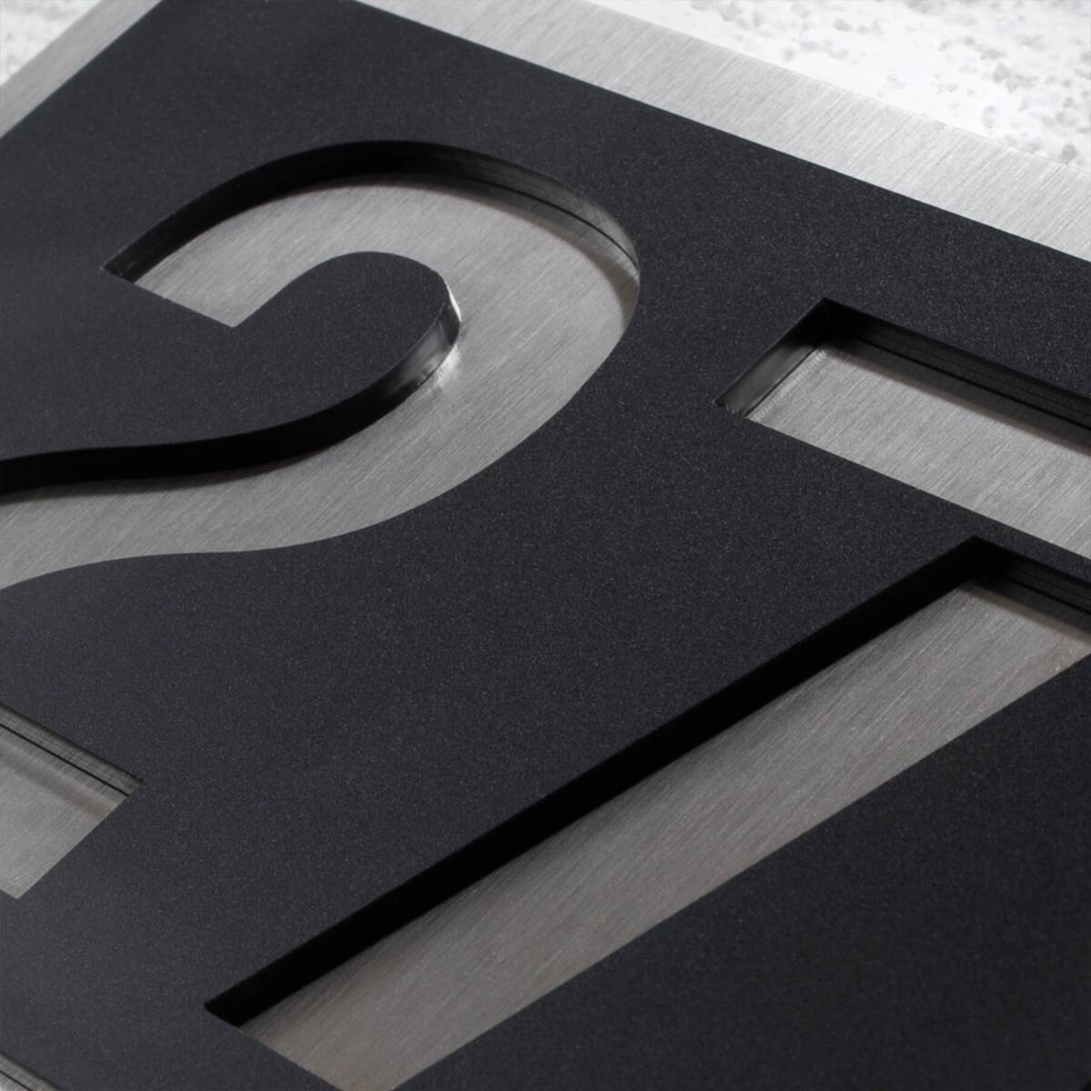 Metzler modernes Hausnummernschild aus V2A Edelstahl und satiniertem Acrylglas in Schwarz