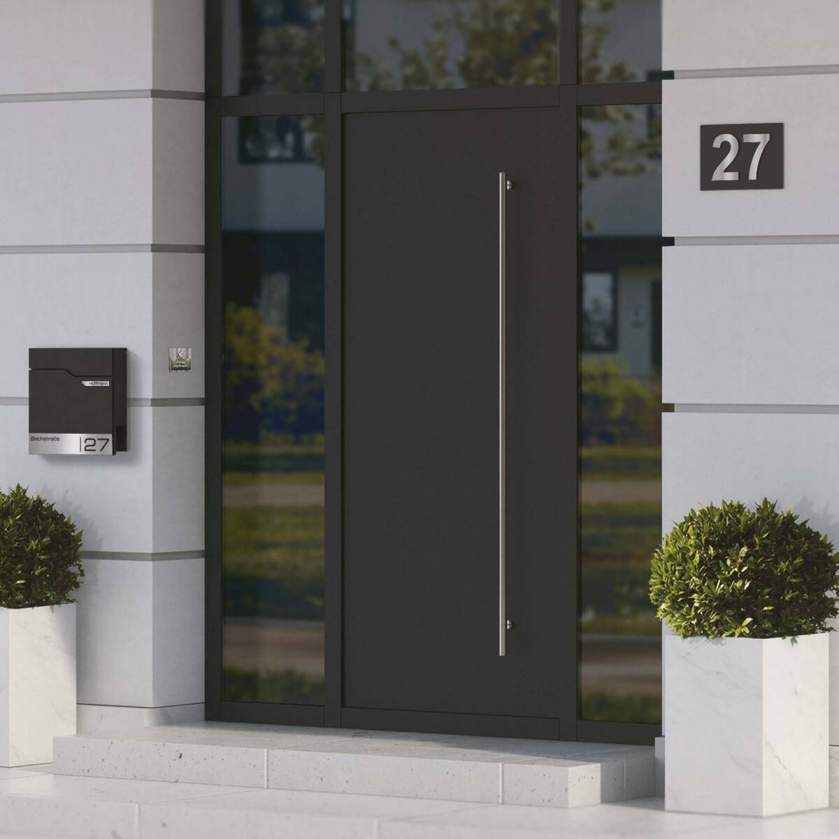 Verleihen Sie der Fassade Ihres Hauses mit dem hochwertigen Hausnummernschild von Metzler den letzten Schliff. Die anthrazitgraue Grundplatte im Farbton RAL 7016 sowie die darauf angebrachten Hausnummern aus 3 mm starkem, gebürstetem Edelstahl ergeben ein exzellentes Gesamtbild. Aufgesetzt werden grob gebürstete Edelstahlziffern (Hausnummern), Höhe 14 cm, aus 0,3 cm starkem, rostfreien V2A. Die extra-starken Ziffern verleihen dem 3D-Hausnummernschild den letzten Schliff und sorgen für einen Schattenwurf in der Sonne. Verschönern Sie Ihre Fassade nachhaltig mit unserem hochwertigen Hausnummernschild. Ganz individuell mit Ihrer Hausnummer.Das komplette Hausnummernschild ist echte Wertarbeit Made in Germany.