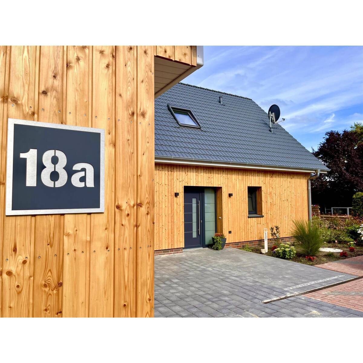 Für ein optimales Gesamtbild sollten als Hausnummer max. 3 Ziffern / Buchstaben verwendet werden. Bei schmalen Zahlen wie 1 können auch 4 Ziffern problemlos auf dem Hausnummernschild Platz finden.