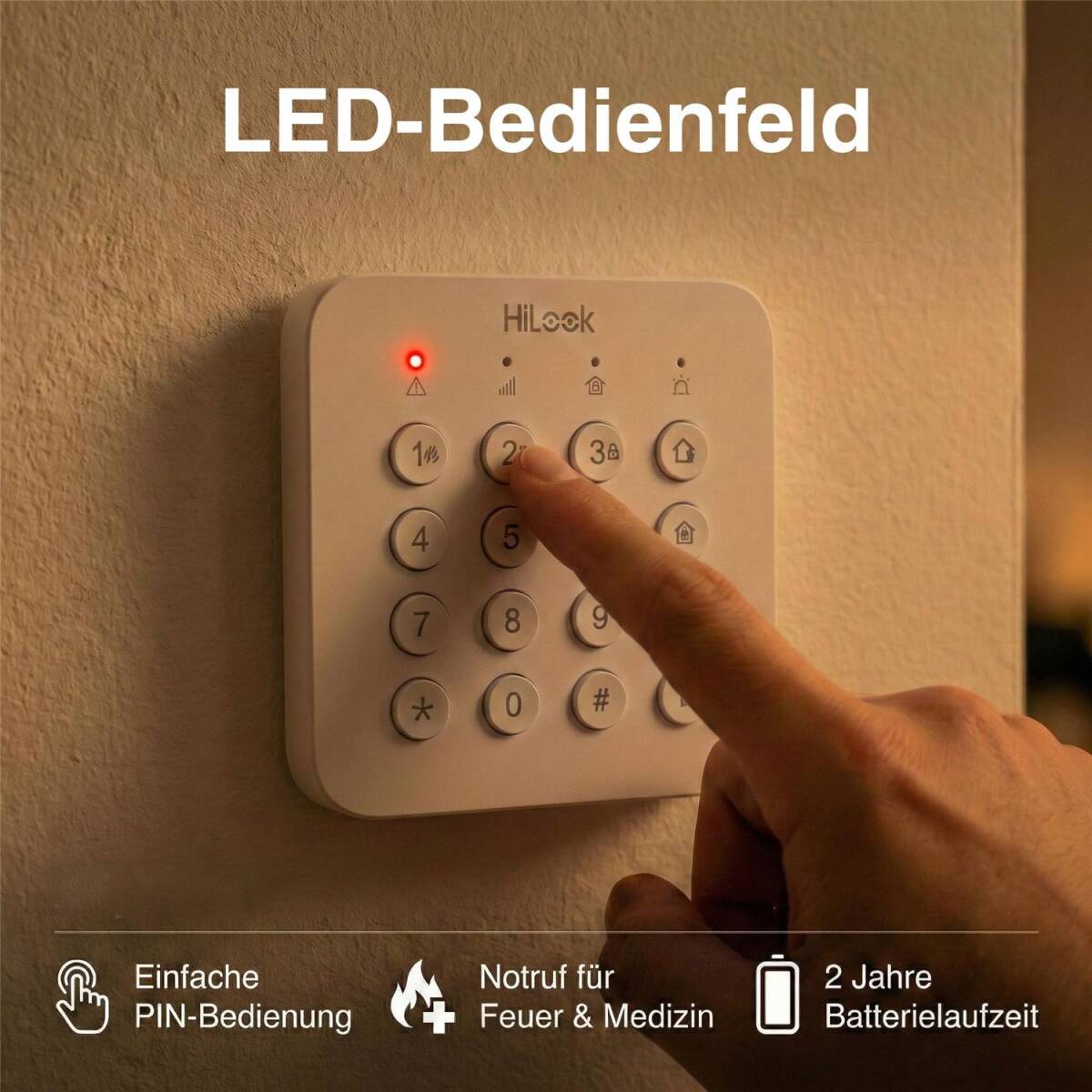 Das HiLook by HIKVISION Alarmanlagen Set ist ein kabelloses Funk-Alarmsystem zur erweiterten Absicherung von Innenräumen. Das Set enthält eine Alarmzentrale sowie mehrere Meldekomponenten zur Überwachung von Bewegungen und Öffnungen. Die Steuerung und Alarmbenachrichtigung erfolgt über die HiLook oder Hik-Connect App.
