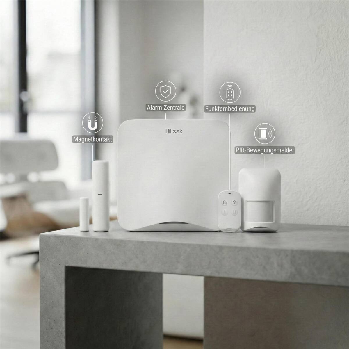 Das HiLook by HIKVISION Alarmanlagen Set ist ein kabelloses Funk-Alarmsystem zur grundlegenden Sicherung von Innenräumen. Das Set kombiniert eine zentrale Steuereinheit mit typischen Meldekomponenten und ermöglicht eine einfache Inbetriebnahme. Die Verwaltung und Alarmbenachrichtigung erfolgt über die HiLook oder Hik-Connect App.