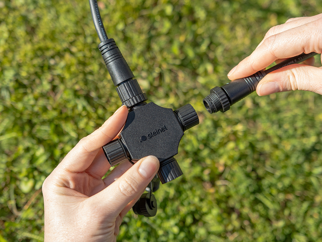 X-Verbinder mit 3 Ausgängen zur Erweiterung des STEINEL 24V Garten Lichtsystems mit 24V Gartenleuchten, Verlängerungskabeln und Konnektoren in verschiedenen Ausführungen
