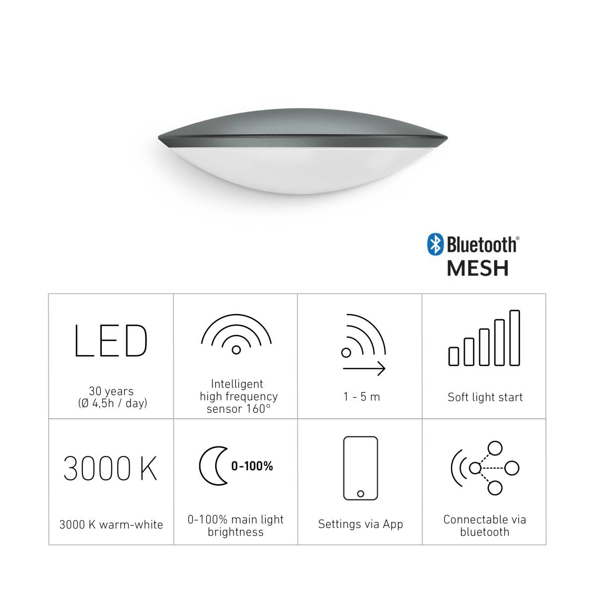 Außen Klassik, innen Zukunft. Sensor Downlight L 825 SC wird per Bluetooth und App leiterlos eingestellt, mit Hochfrequenz-Sensor, ideal für Hauseingänge und -fronten. 9,7 W STEINEL LED-Lichtsystem, 707 lm, 160° Erfassungswinkel, einstellbare Reichweite von 1-5 m, optionales Grundlicht 10 %, 4 h Dauerlicht optional.
