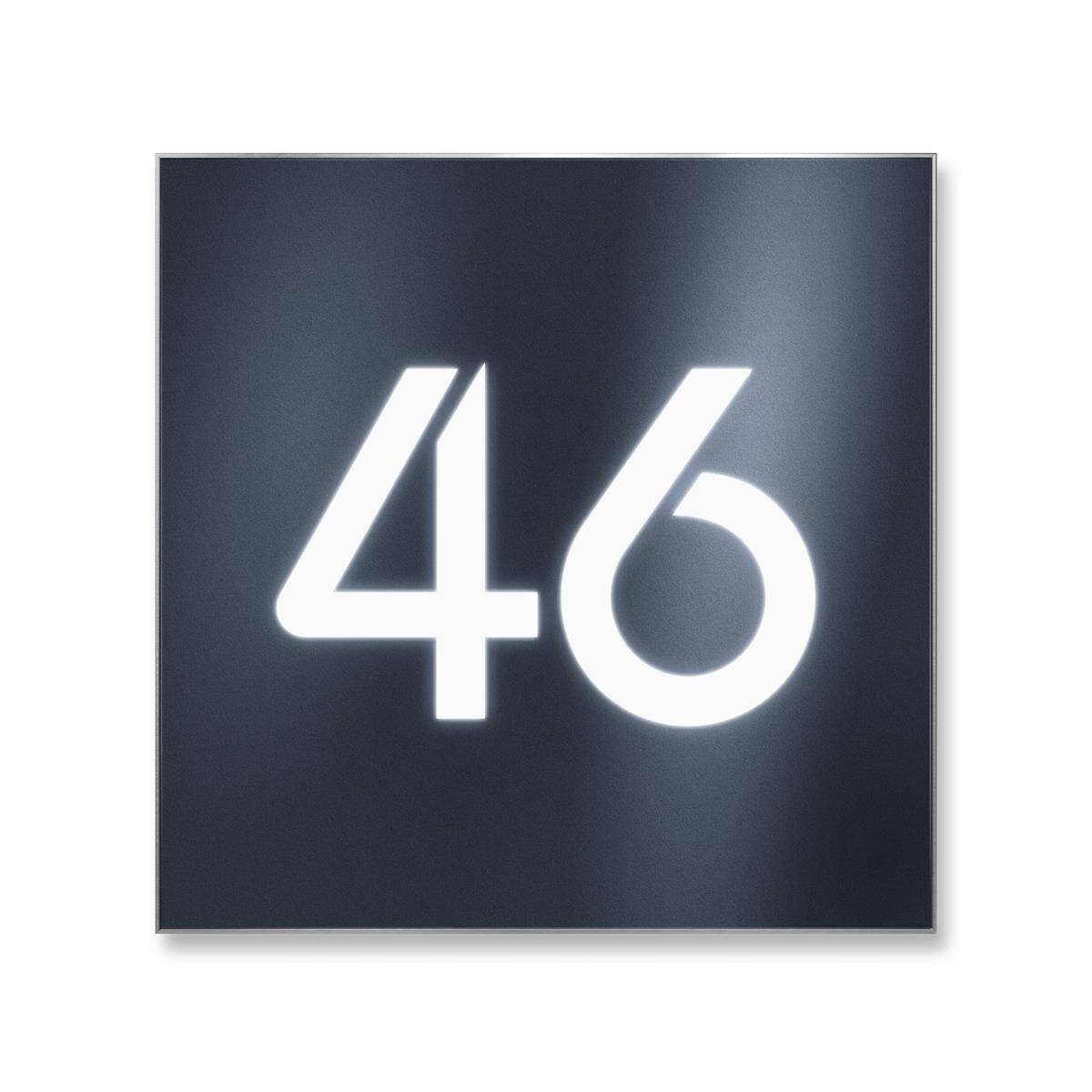 Quadratisches Hausnummernschild mit LED-Beleuchtung aus Edelstahl in Anthrazit