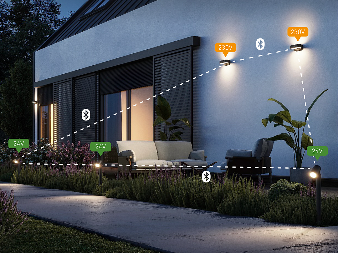 Mit einem Netzteil (35 W oder 100W) können Sie bis zu 30 m Kabellänge und mehrere Leuchten in Reihe betreiben. Dank Bluetooth Mesh kommunizieren die Leuchten auch über größere Entfernungen stabil miteinander – ideal für große Gärten.