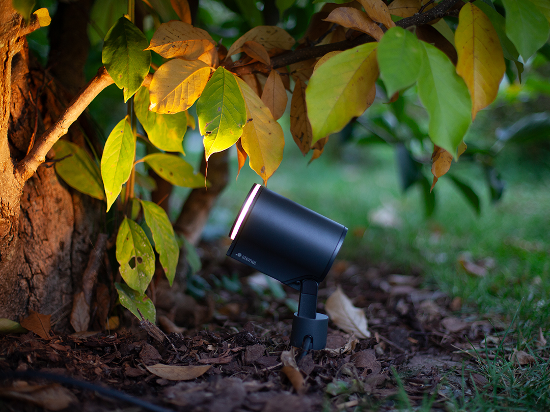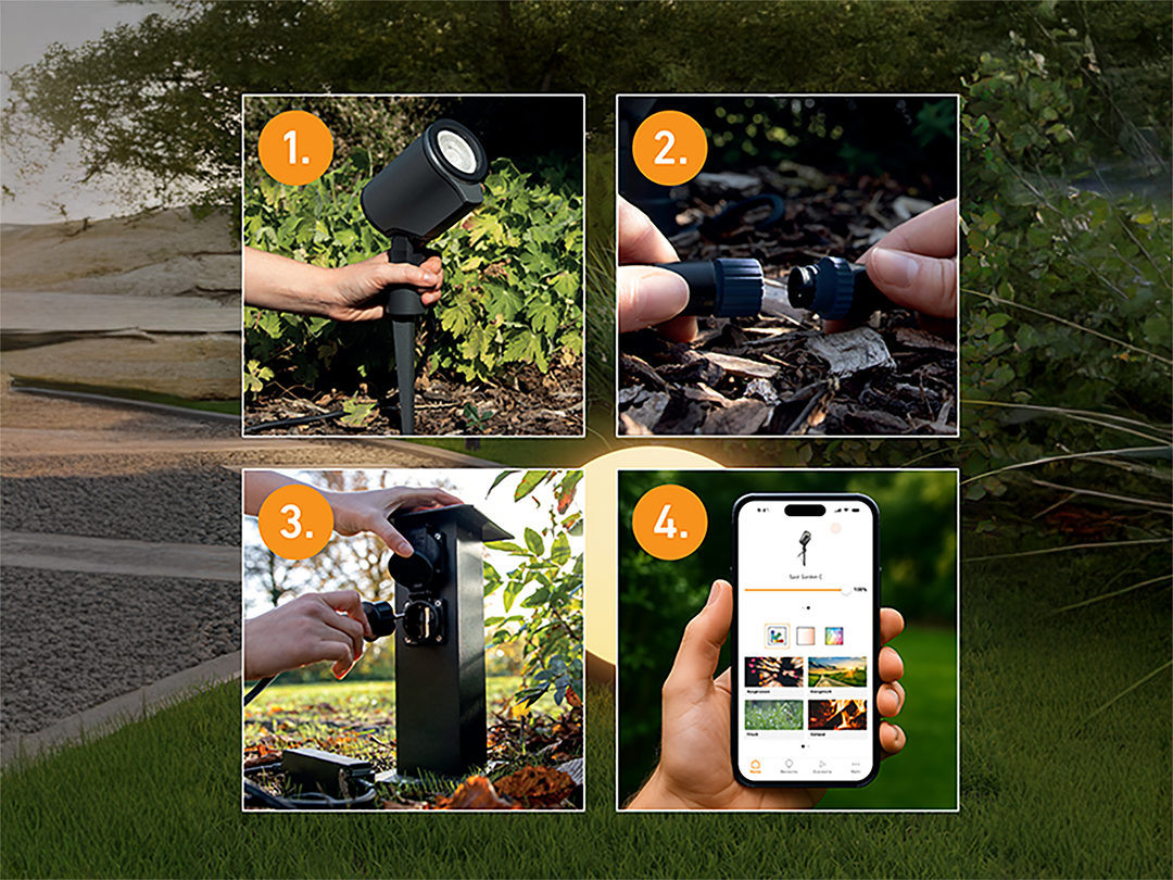 Mit der einfachen Drehverbindung des 24V Garten-Lichtsystems von STEINEL lassen sich Leuchten und Komponenten werkzeuglos verbinden – einfach drehen, anschließen und per Bluetooth koppeln. Die Steuerung erfolgt bequem über die App.