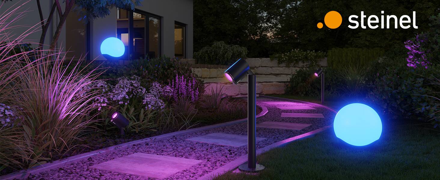 Steuern Sie Ihre Gartenbeleuchtung bequem per kostenloser STEINEL Connect App: Lichtfarbe und Szene wählen, stufenlos dimmen, Zeitpläne setzen oder unterschiedliche Beleuchtungs-Gruppen erstellen – ganz ohne zusätzliche Bridge