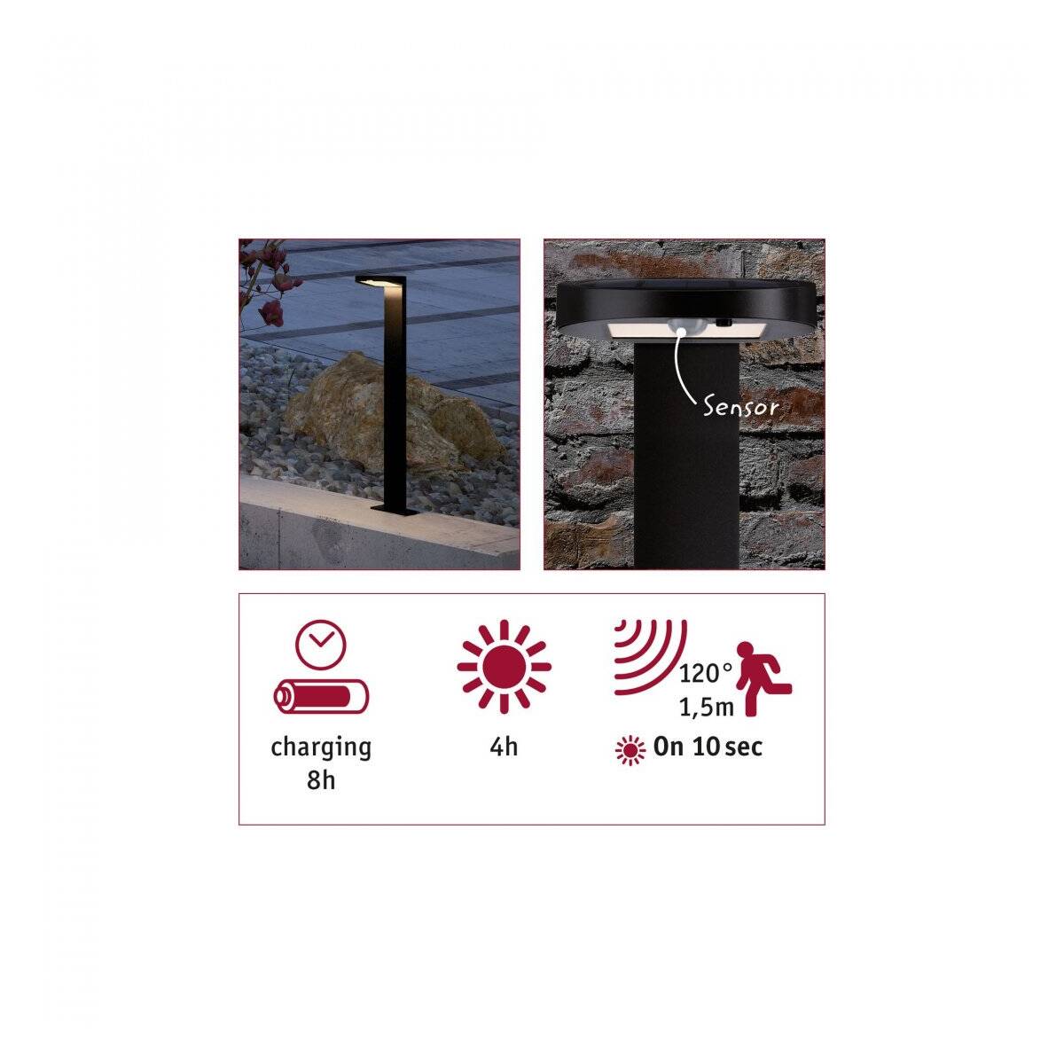 Die Solarleuchte Ryse in Anthrazit bringt Licht auf Ihre Wege. Dank praktischer Solartechnik, ist ein Stromanschluss für die Montage nicht notwendig. Tagsüber wird der Akku durch Sonnenlicht aufgeladen und in der Dämmerung wird das Funktionslicht ausgelöst, sobald sich Jemand nähert.