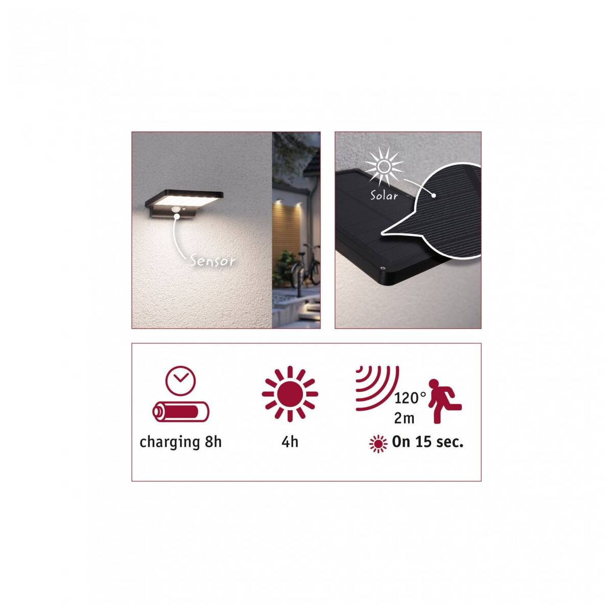 Die Solar-Wandleuchte Solveig in Schwarz und 338 lm bringt Licht an die Außenwände und leuchtet den Bereich vor der Haustür aus. Dank praktischer Solartechnik, ist ein Stromanschluss für die Montage nicht notwendig. Tagsüber wird der Akku durch das Sonnenlicht aufgeladen und in der Dämmerung leuchtet ein kleines Orientierungslicht, das von einem Funktionslicht abgelöst wird, sobald sich jemand nähert. Die Leuchte ist durch ihren IP44-Schutz speziell gegen das Eindringen von Feuchtigkeit und Staub geschützt.