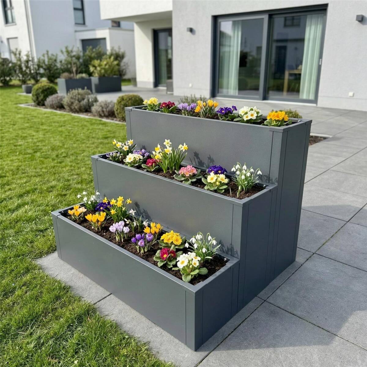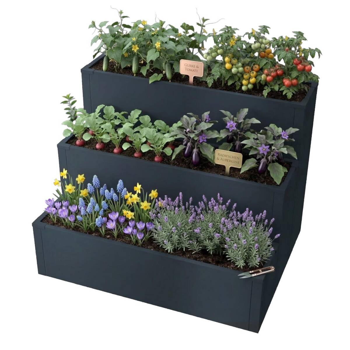 Durch die unterschiedlichen Höhen bietet das Set optimale Bedingungen für eine strukturierte Bepflanzung. Kräuter, Blumen, Gemüse oder Zierpflanzen mit verschiedenen Wuchshöhen und Wurzelbedarf lassen sich übersichtlich anordnen und bequem pflegen.