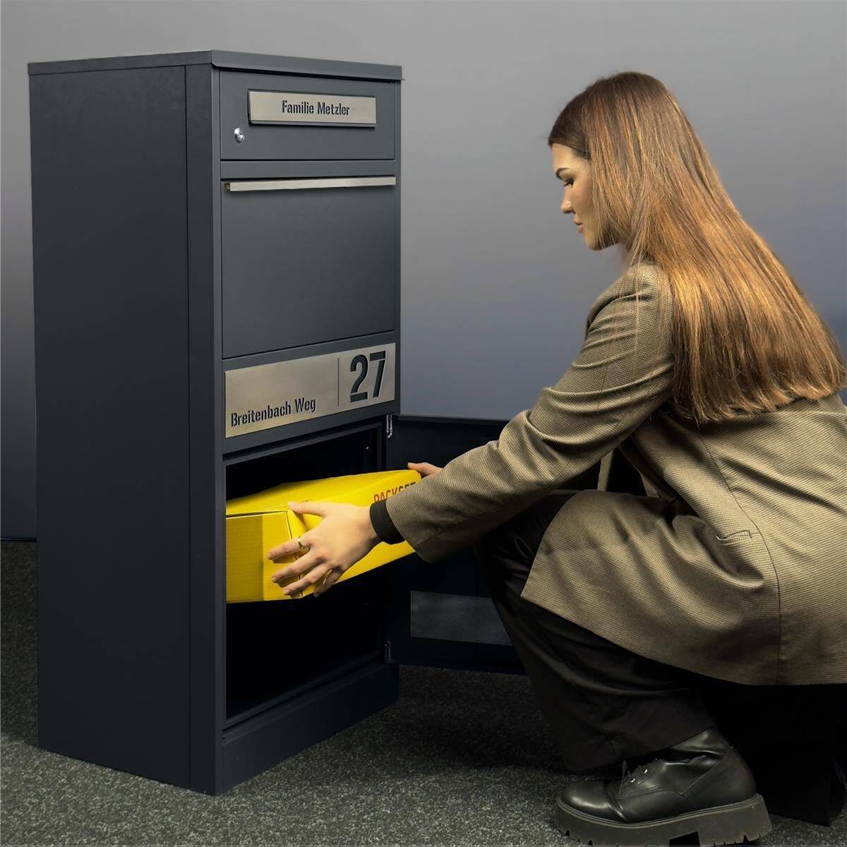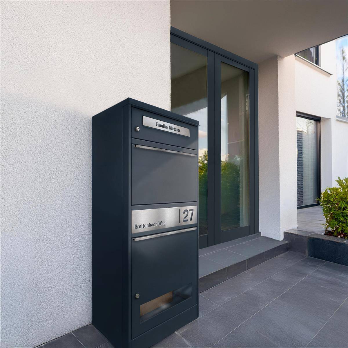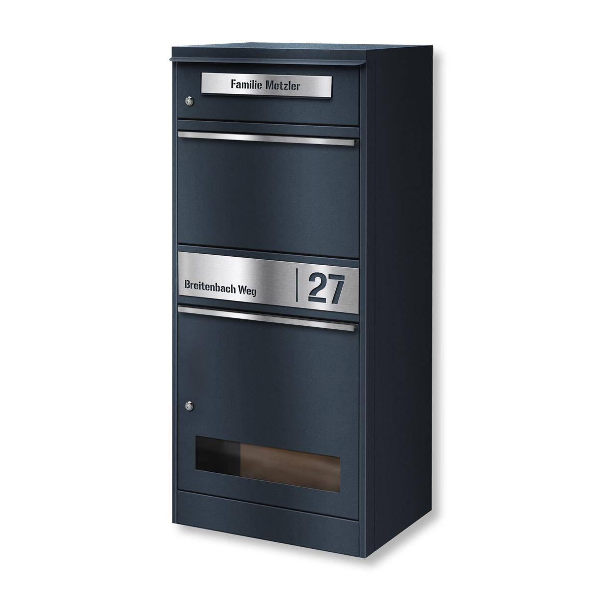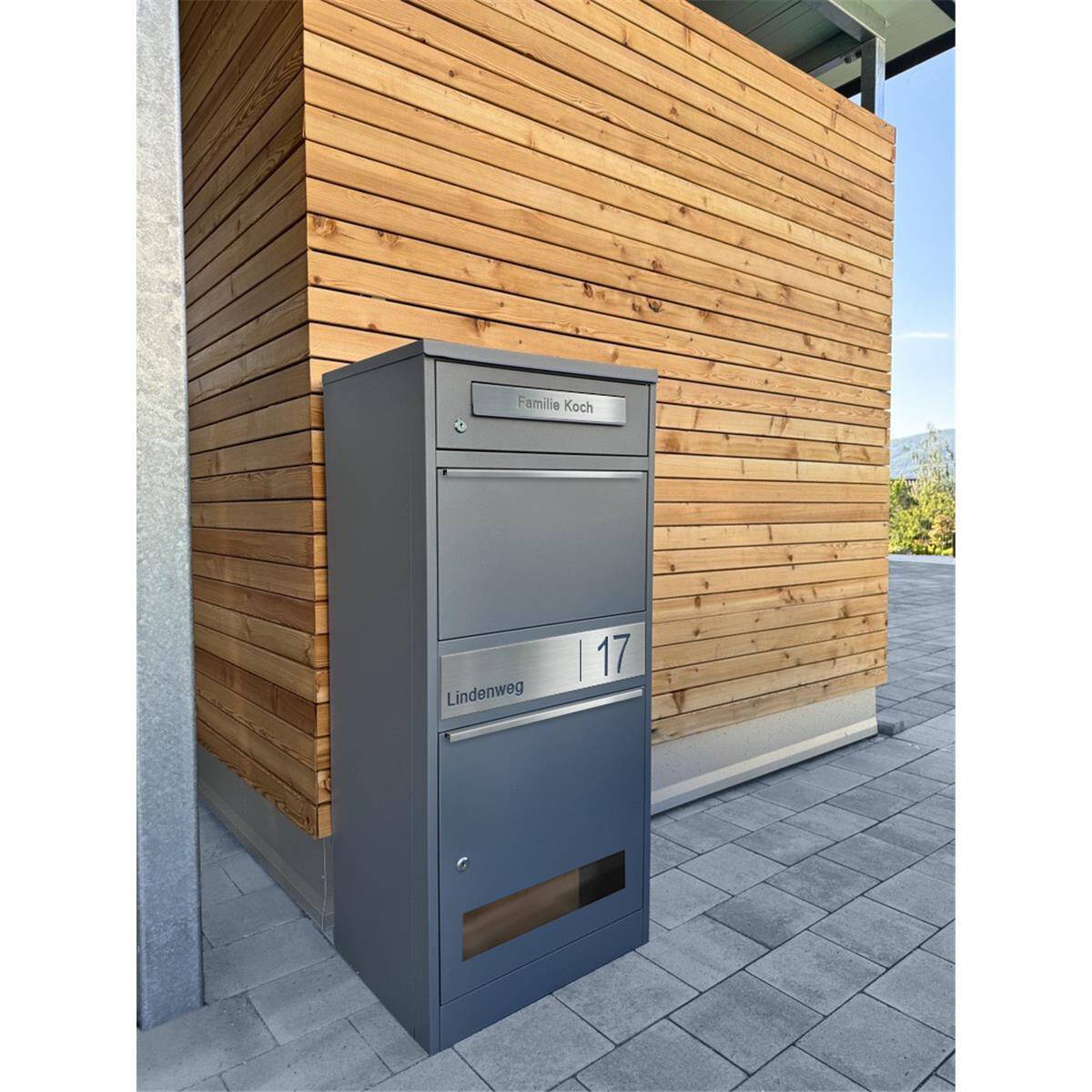 Metzler Boîte aux lettres et à colis inoxydable et massive, RAL7016 gris anthracite mat, modèle Bispo 3 avec personnalisation et vitre