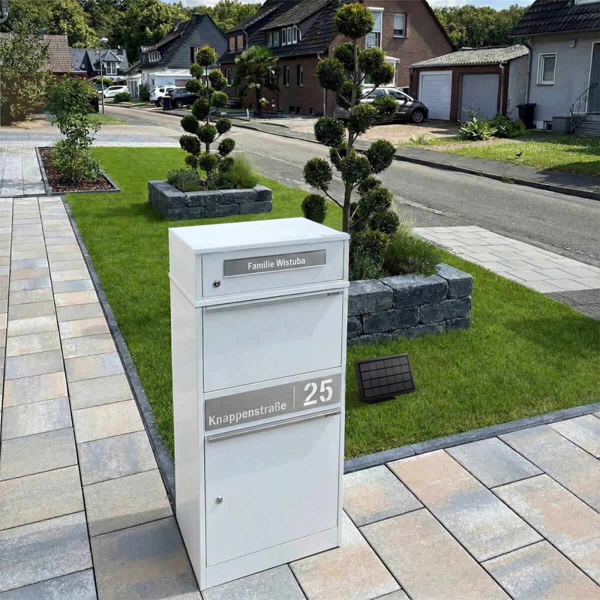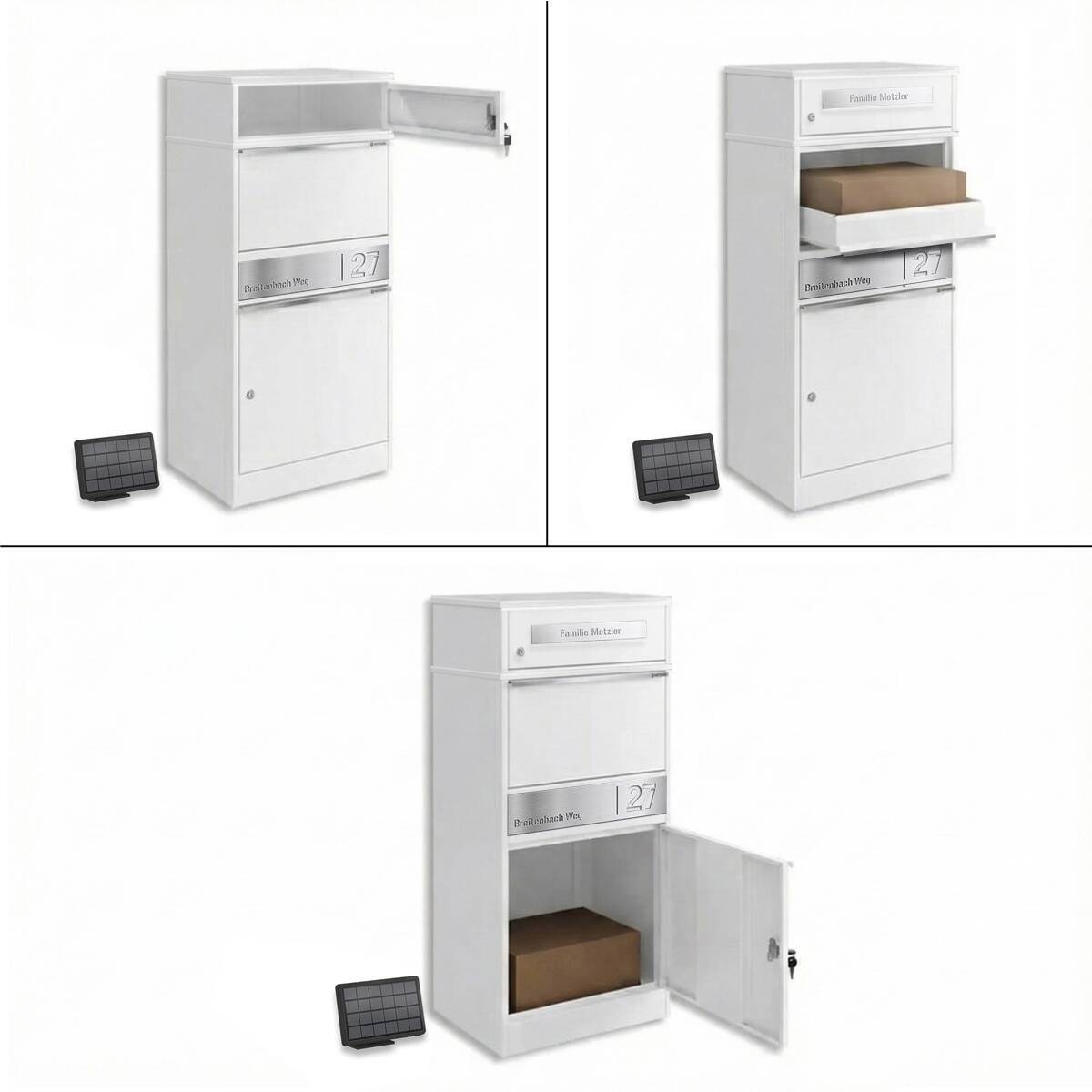 Le grand atout de cette boîte à colis : elle dispose d’un éclairage LED, alimenté d’un panneau solaire, qui peut être monté flexiblement directement sur la boîte ou à côté. L’éclairage est surtout utile pendant la nuit pour trouver la boîte immédiatement.