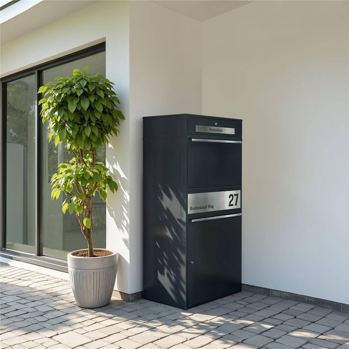 Votre adresse et votre nom sont gravés dans la plaque en acier inoxydable à haute précision. La combinaison de la boîte en anthracite et de la bande en acier inoxydable crée un très joli effet 3D qui combine fonctionnalité et design.