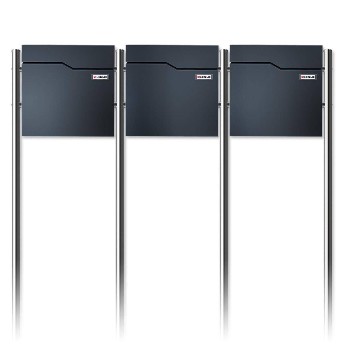 Boîte aux lettres pour maisons avec 3 appartements/parties fabriquée en acier massif. Les boîtes aux lettres sont revêtues en poudre en RAL 7016 anthracite après la production pour une meilleure résistance aux intempéries. Ainsi, votre boîte ne doit craindre ni le vent, ni la pluie. Grâce aux surfaces de gravure en acier inoxydable, elle se distingue des produits de masse et convainc par sa pure qualité Metzler.