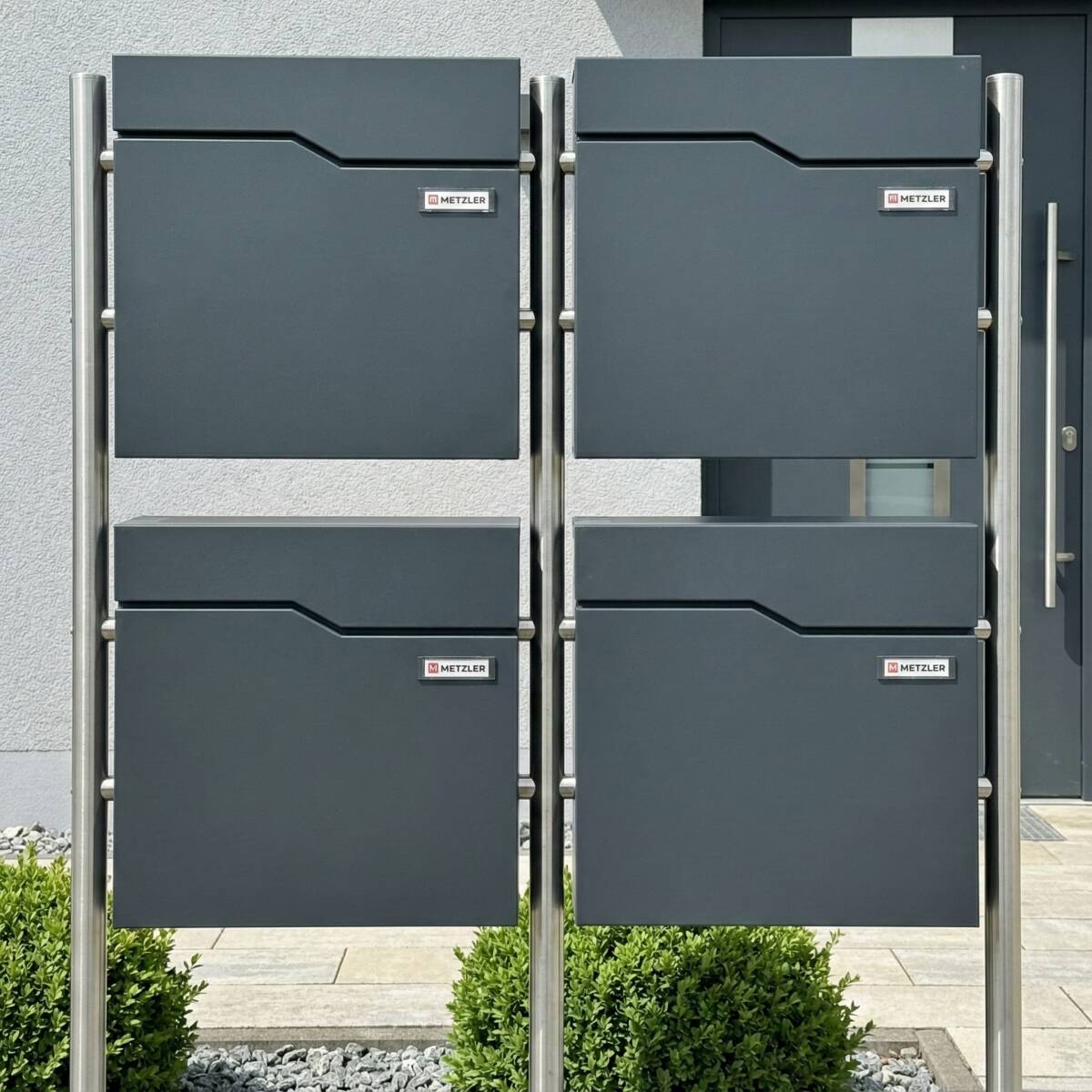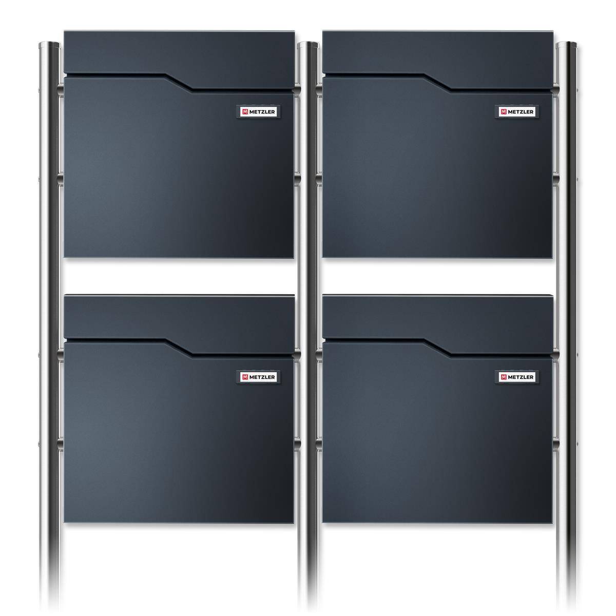 Boîte aux lettres pour maisons avec 4 appartements/parties fabriquée en acier massif. Les boîtes aux lettres sont revêtues en poudre en RAL 7016 anthracite pour une meilleure résistance aux intempéries. Ainsi, votre boîte ne doit craindre ni le vent, ni la pluie. Grâce aux surfaces de gravure en acier inoxydable, elle se distingue des produits de masse et convainc par sa pure qualité Metzler.