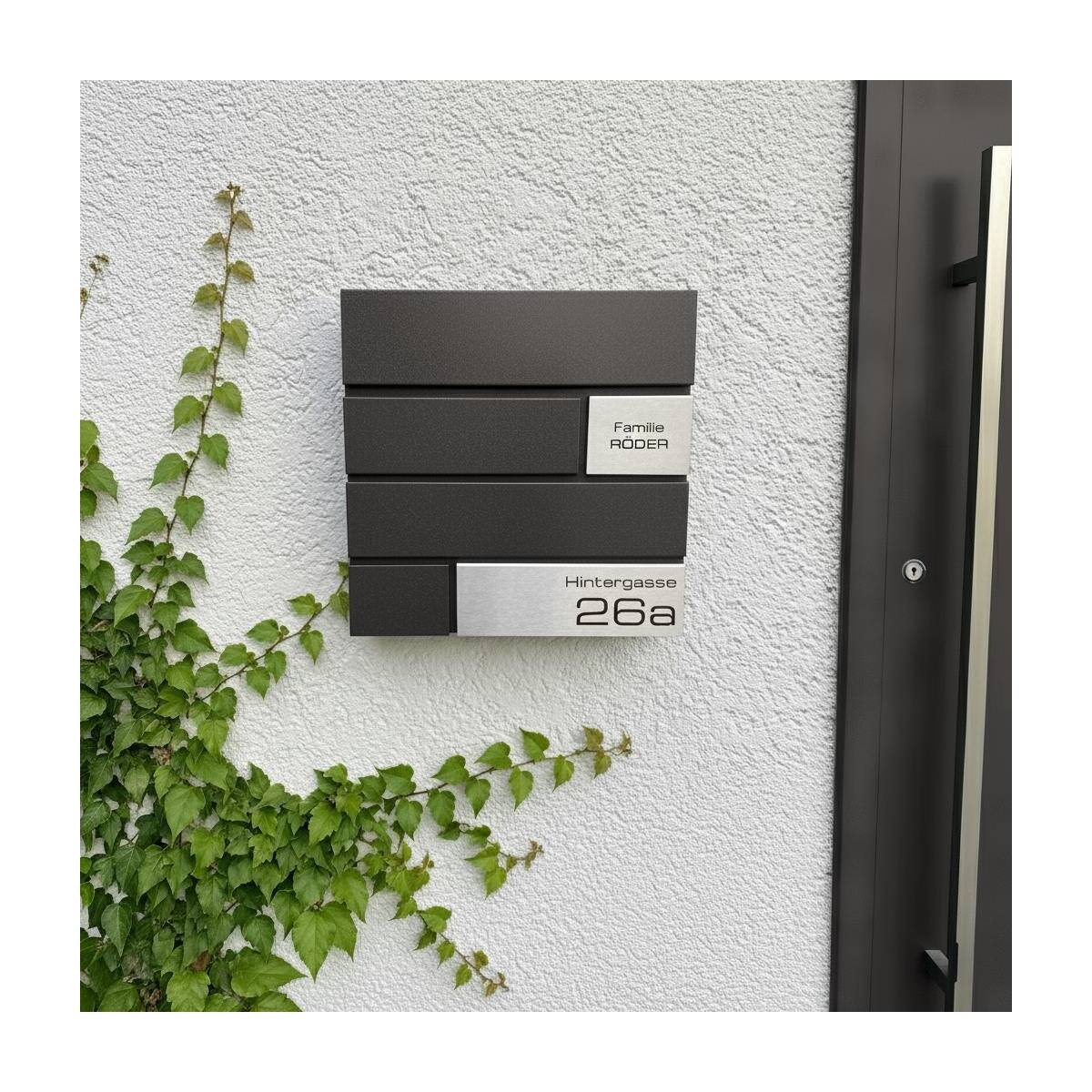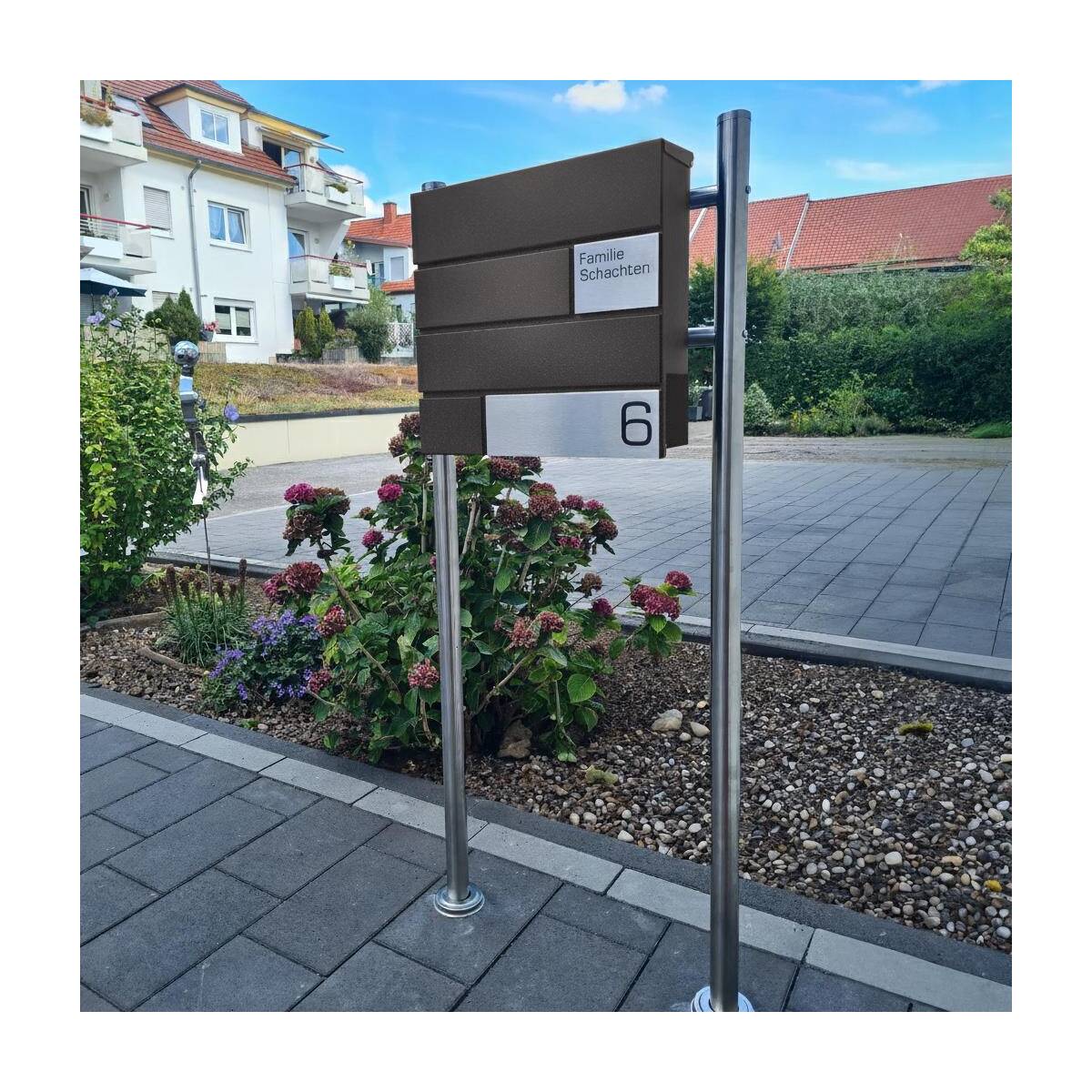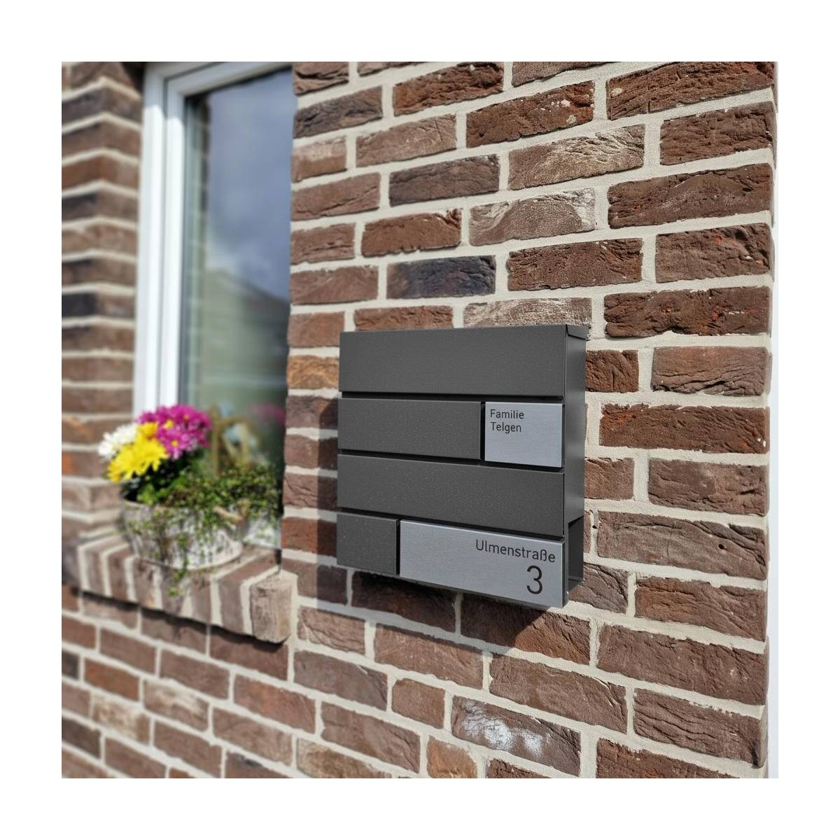 Cette boîte aux lettres est fabriquée en acier massif et de grande qualité. Pour la rendre encore plus résistante aux intempéries, l‘acier est revêtu minutieusement de poudre en mica de fer, surface fine mate, après être raffiné. Il est donc garanti que votre boîte aux lettres ne doit craindre ni le vent, ni la pluie. Non seulement le design esthétique sait impressionner, mais aussi les plaques gravées en acier inoxydable. On vous offre un choix parmi plusieurs polices de caractères modernes pour les faire engraver avec votre nom, votre rue et votre numéro de maison.