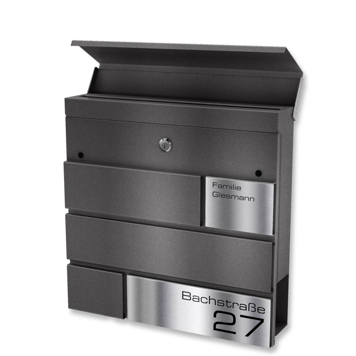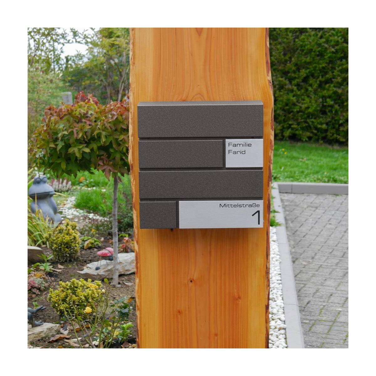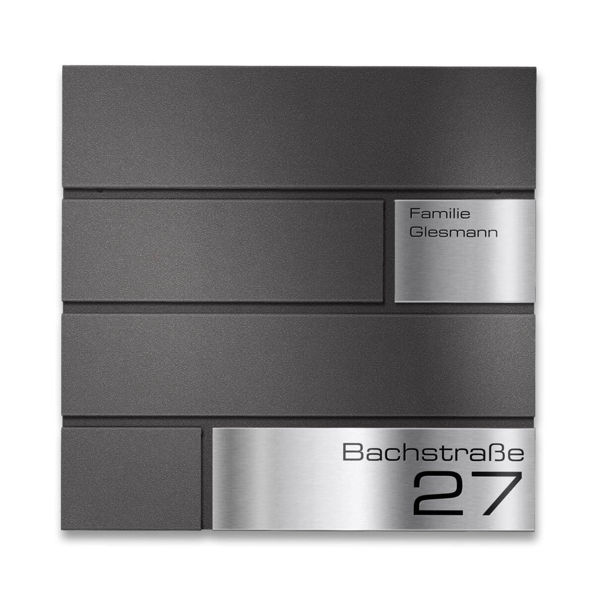 Cette boîte aux lettres est fabriquée en acier massif et de grande qualité. Pour la rendre encore plus résistante aux intempéries, l‘acier est revêtu minutieusement de poudre en mica de fer, surface fine mate, après être raffiné. Il est donc garanti que votre boîte aux lettres ne doit craindre ni le vent, ni la pluie. Non seulement le design esthétique sait impressionner, mais aussi les plaques gravées en acier inoxydable. On vous offre un choix parmi plusieurs polices de caractères modernes pour les faire engraver avec votre nom, votre rue et votre numéro de maison.