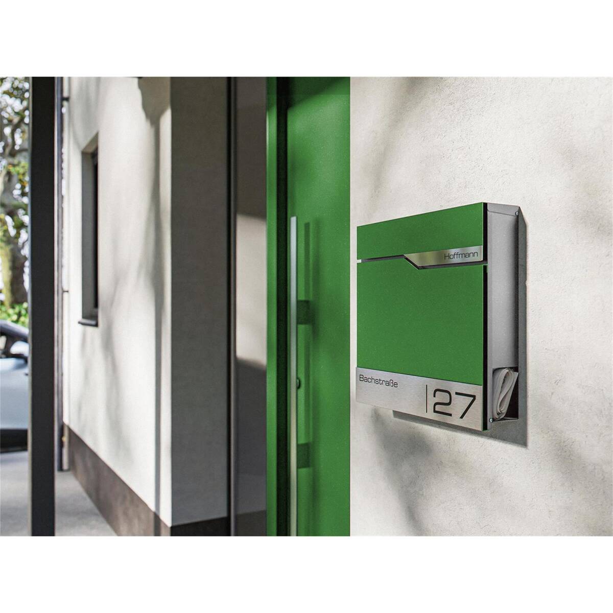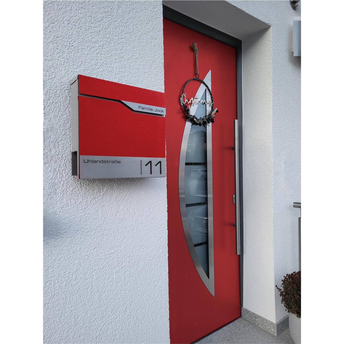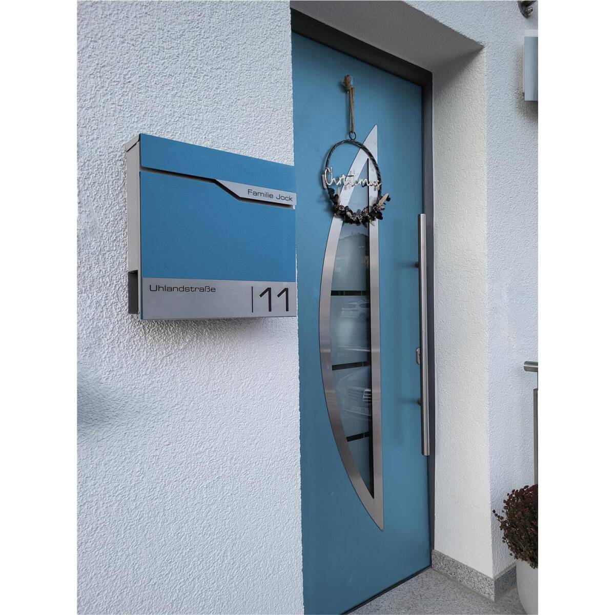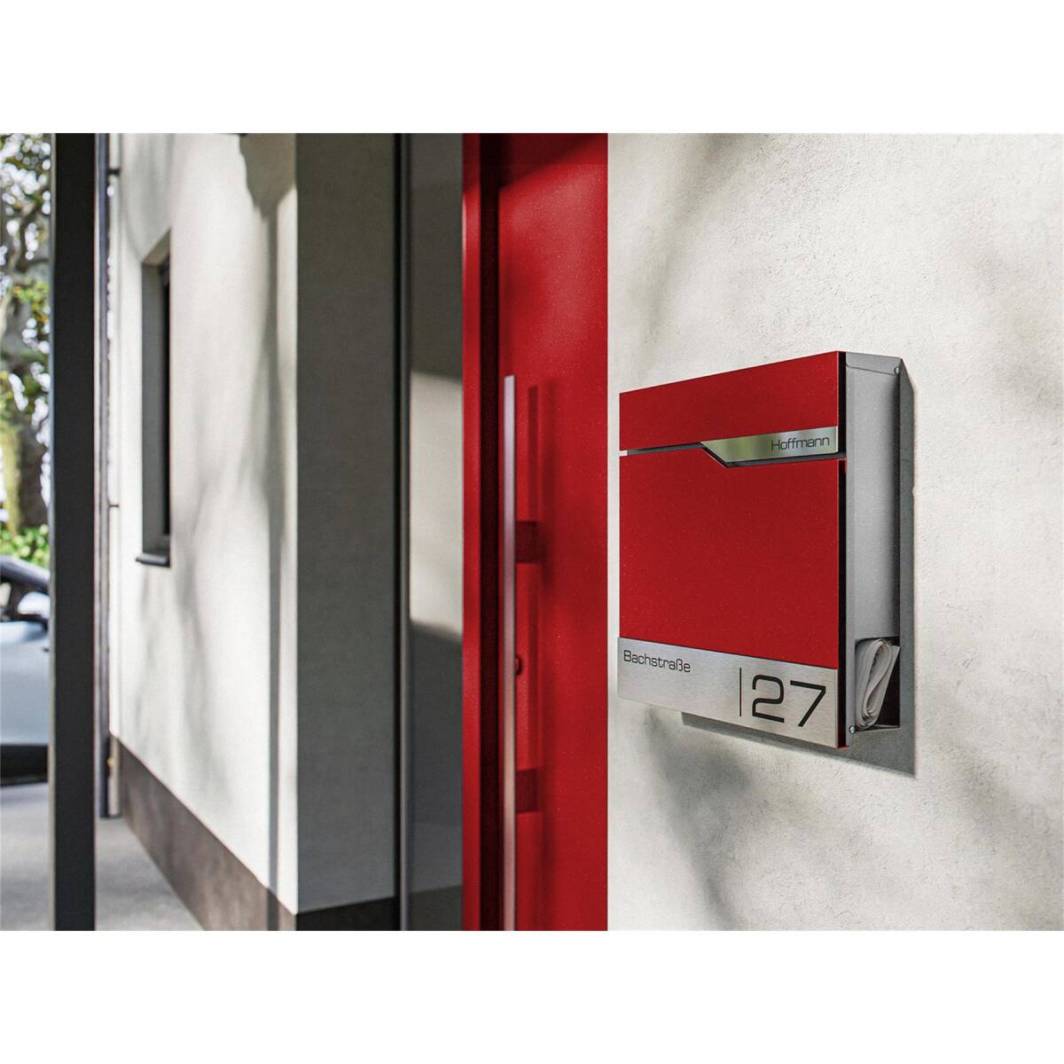 Les bandes gravées en acier inoxydable sont particulièrement remarquables. Vous avez l’option de faire graver votre nom sur la plaque autocollante supérieure. La deuxième bande en acier inoxydable peut être inscrite du nom de la rue et le numéro de maison. On vous offre le choix entre vingt polices de caractères différentes pour donner une caractéristique individuelle à votre boîte aux lettres. Au cas de changements, vous pouvez facilement utiliser une plaque remplaçante disponible chez nous (numéro d’article 28699).