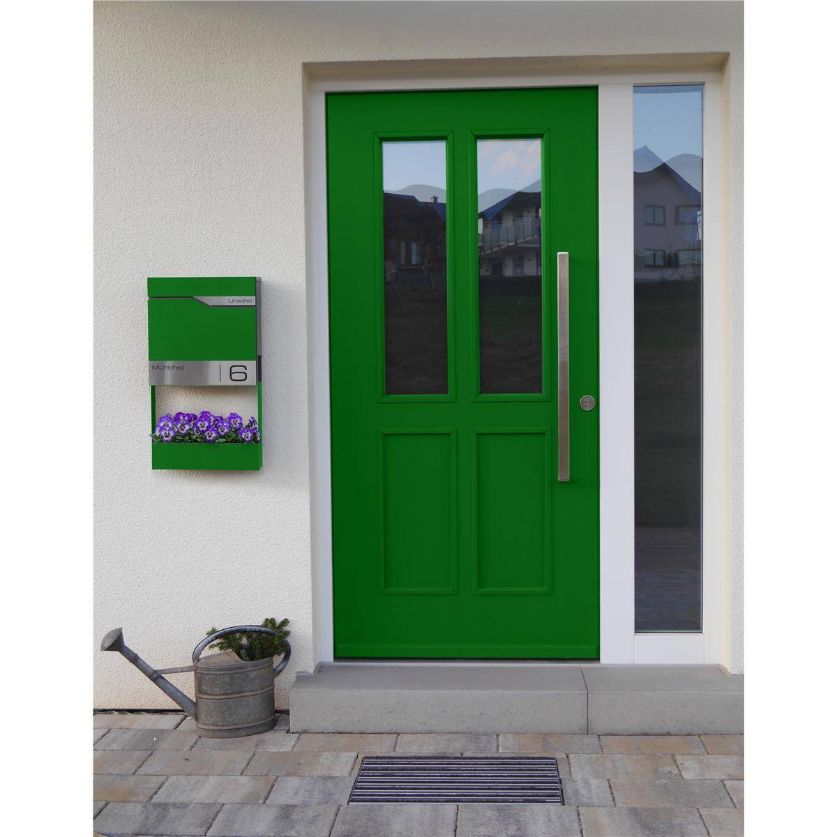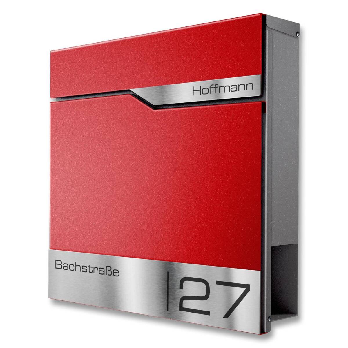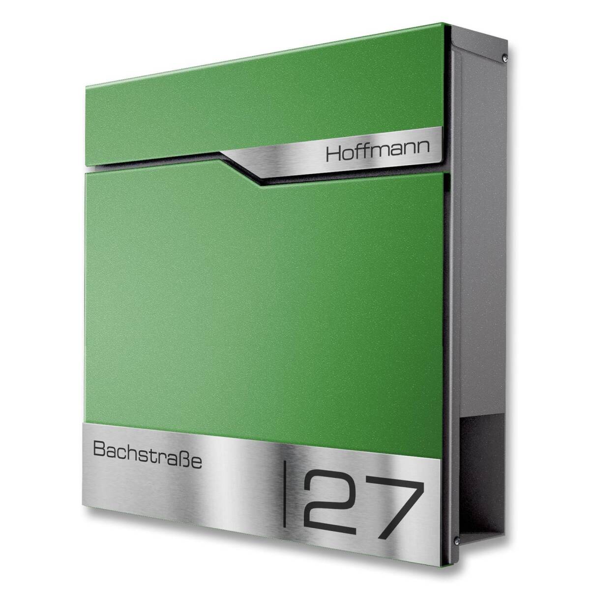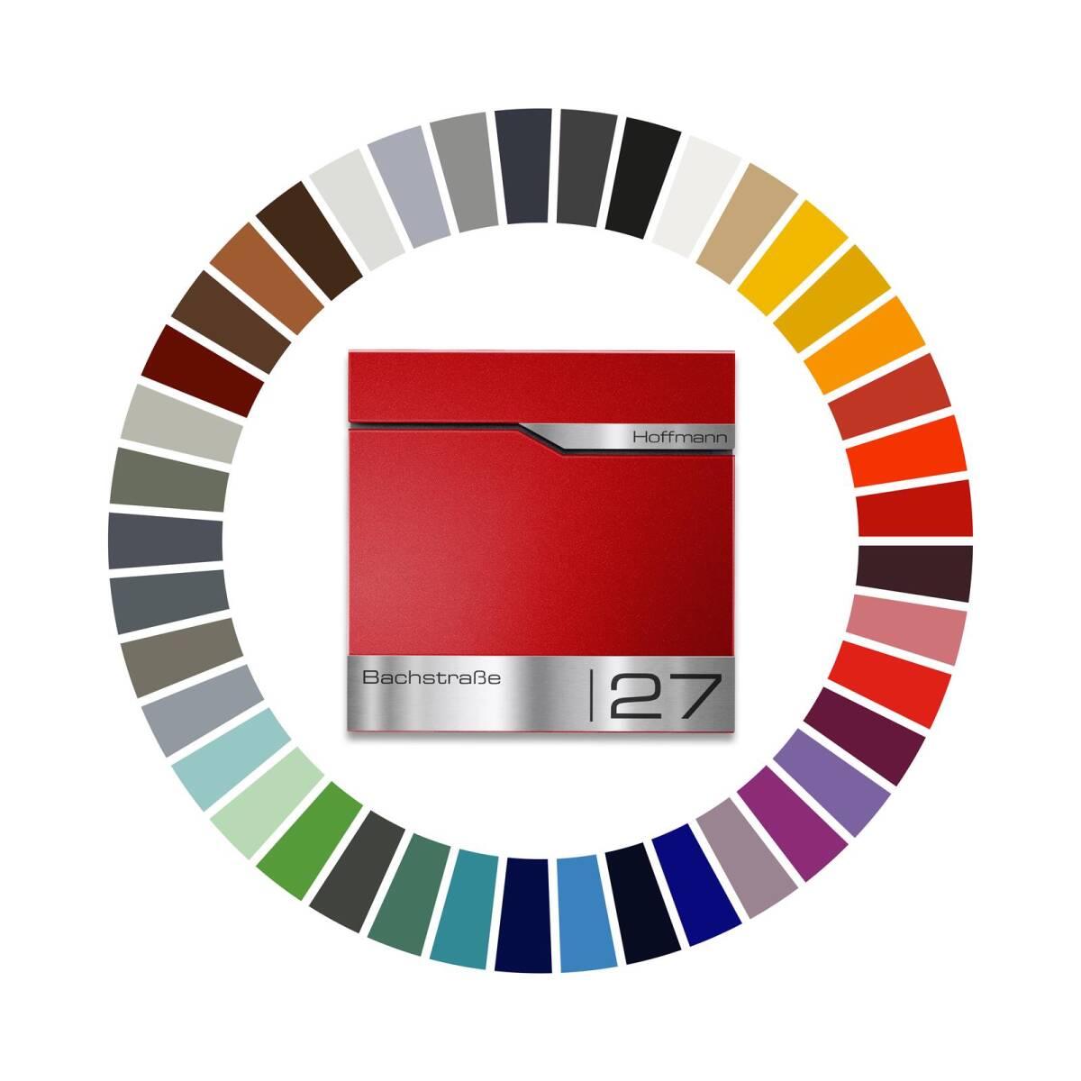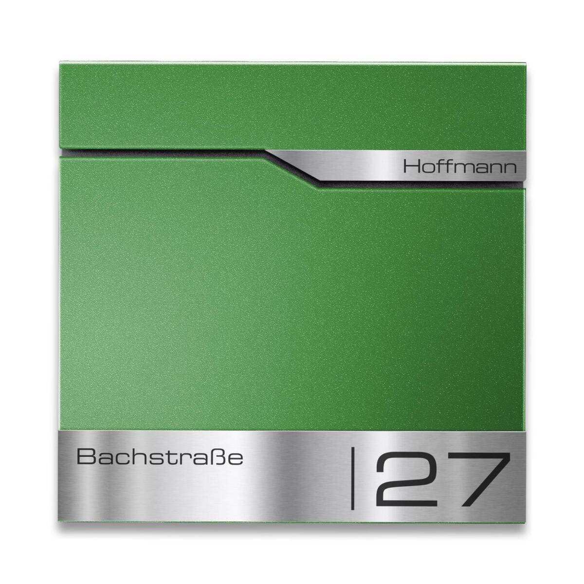 Les bandes gravées en acier inoxydable sont particulièrement remarquables. Vous avez l’option de faire graver votre nom sur la plaque autocollante supérieure. La deuxième bande en acier inoxydable peut être inscrite du nom de la rue et le numéro de maison. On vous offre le choix entre vingt polices de caractères différentes pour donner une caractéristique individuelle à votre boîte aux lettres. Au cas de changements, vous pouvez facilement utiliser une plaque remplaçante disponible chez nous (numéro d’article 28699).
