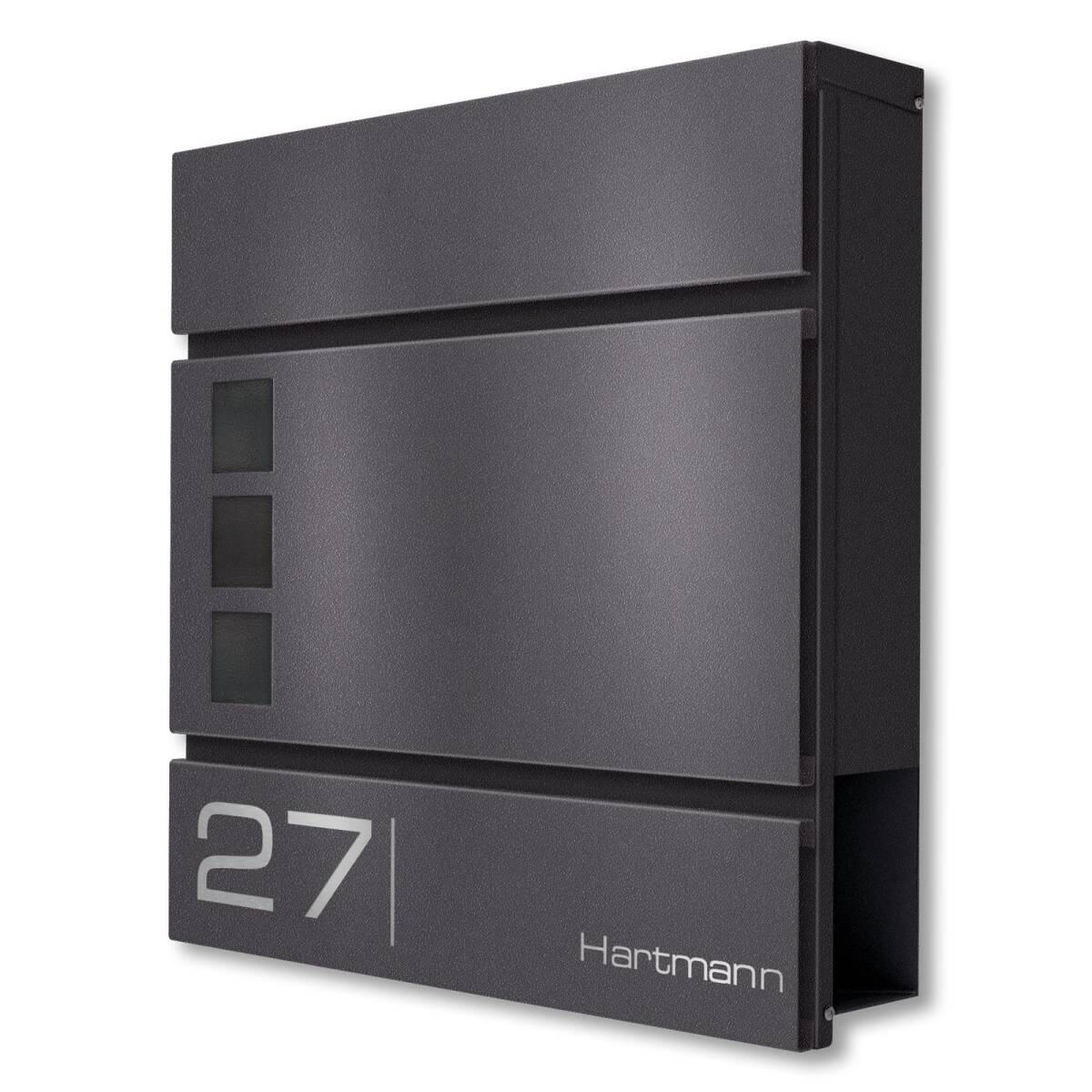 La boîte aux lettres est fabriquée en acier massif de haute qualité. Pour la rendre encore plus résistante aux intempéries, l’acier est revêtu en poudre en mica de fer DB703, structure fine mate, après être affiné. Votre boîte doit donc craindre ni le vent, ni la pluie. Comme bonus, on vous offre une variété de polices de caractères moderne pour la gravure de votre nom et numéro de maison pour donner de l’individualité à votre boîte aux lettres.