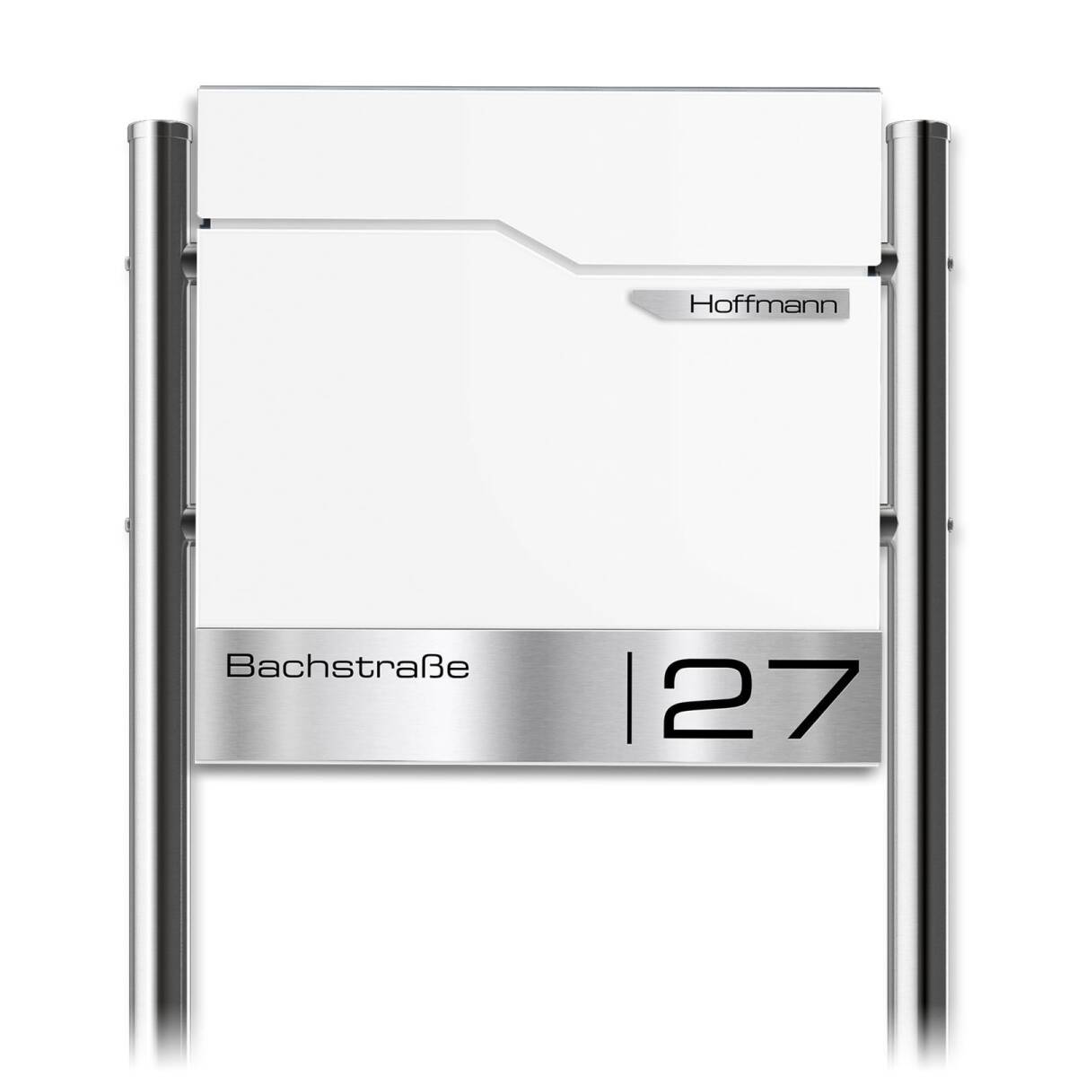 Cette boîte aux lettres avec support de la série Hoffmann est fabriquée en acier massif de haute qualité. Pour la rendre encore plus résistante aux intempéries, l‘acier est revêtu minutieusement de poudre en RAL 9016 blanc signalisation, structure fine mate, après la gravure laser de nom de rue et numéro de maison. Il est donc garanti que votre boîte aux lettres ne doit craindre ni le vent, ni la pluie.