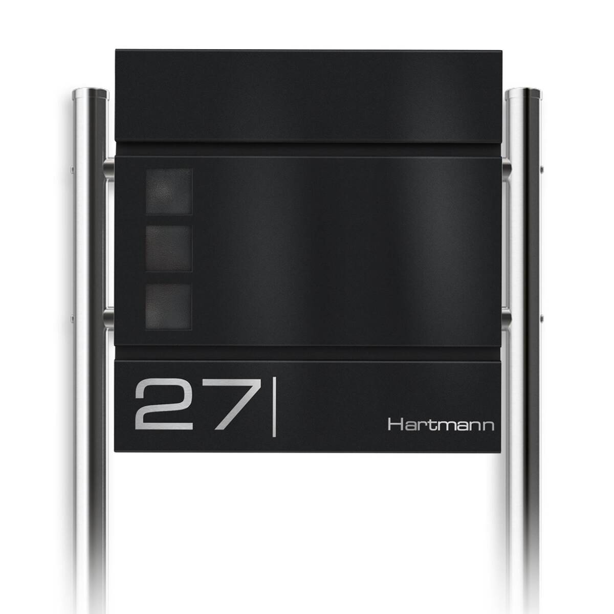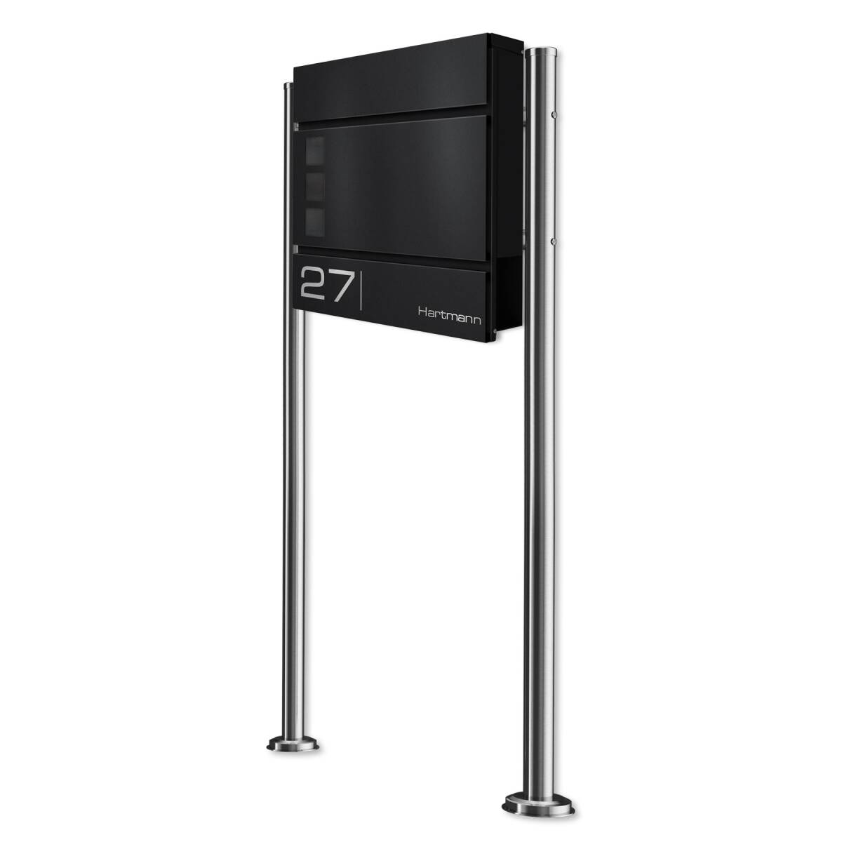 La boîte aux lettres pour ancrage est fabriquée en acier massif de haute qualité. Pour la rendre encore plus résistante aux intempéries, l’acier est minutieusement revêtu en poudre en noir foncé RAL 9005, structure fine mate, après être affiné. Votre boîte ne doit donc craindre ni le vent, ni la pluie. Comme bonus, on vous offre le choix entre une variété de polices de caractères modernes pour la gravure de votre nom et numéro de maison pour personnaliser votre boîte.