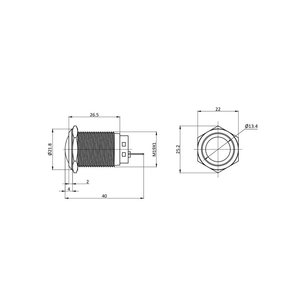 Etendues des fournitures : 1× Metzler - Bouton poussoir momentané 19mm - Illumination annulaire LED Jaune - IP67 IK10 - Acier inoxydable - Vouté - Contacts de soudage, 1× écrou à six pans, 1× bague d'étanchéité, cosses plates