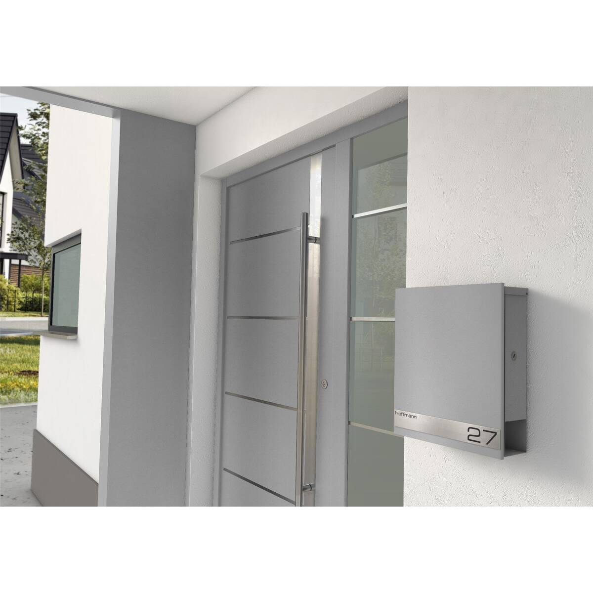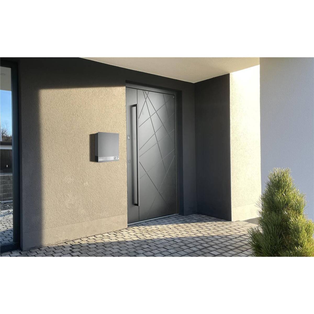 Die Edelstahlleiste bietet einen schönen Kontrast zum anthrazitgrauen Hintergrund. Mit dieser hochwertigen und intelligenten Lösung heben Sie sich stilvoll von Ihren Nachbarn ab und sorgen für einen echten Hingucker in Ihrem Eingangsbereich.