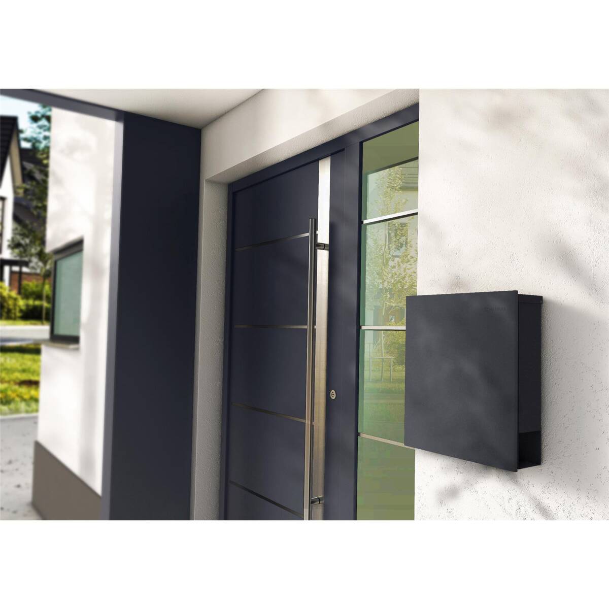 Die spezielle Briefkastenkonstruktion sorgt dafür, dass Ihre Post selbst bei Starkregen und Sturm nicht nass werden kann. Die sauber auf zwei Gummidämpfern schließende Briefkastenklappe schützt Ihre Briefe und Postsendungen zuverlässig vor Wind und Wetter und schließt zudem nahezu lautlos. Der rostfreie Stahlkorpus garantiert maximale Stabilität und lange Haltbarkeit. Die Pulverbeschichtung in Anthrazitgrau RAL 7016 Feinstruktur matt sorgt für zusätzlichen Schutz vor Wind und Wetter über Jahre hinweg. Der Briefkasten bietet nicht nur genügend Platz für Ihre Postsendungen und Zeitungen, der integrierte Postfang sorgt auch dafür, dass beim Öffnen keiner Ihrer Briefe zu Boden fallen kann.