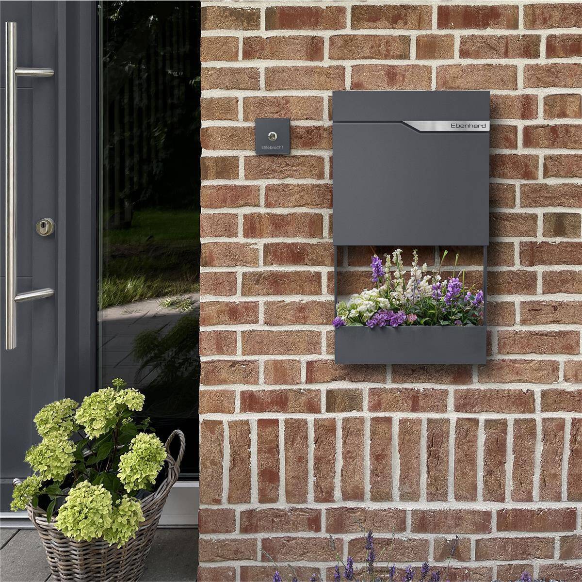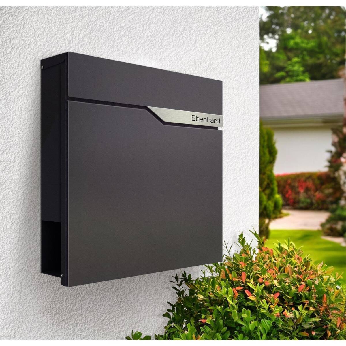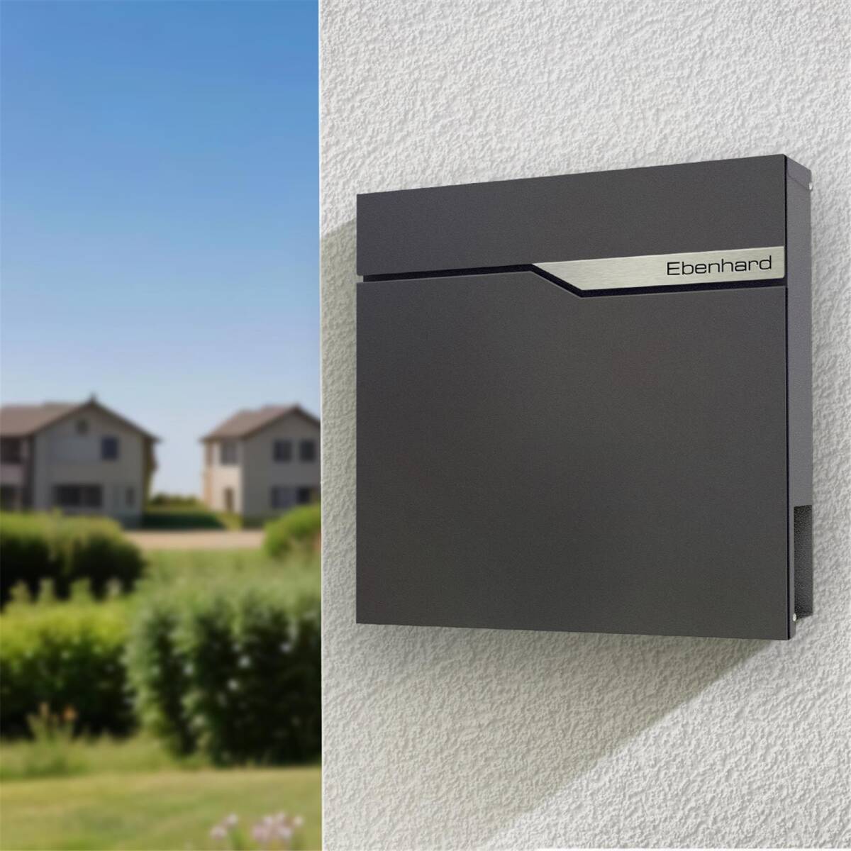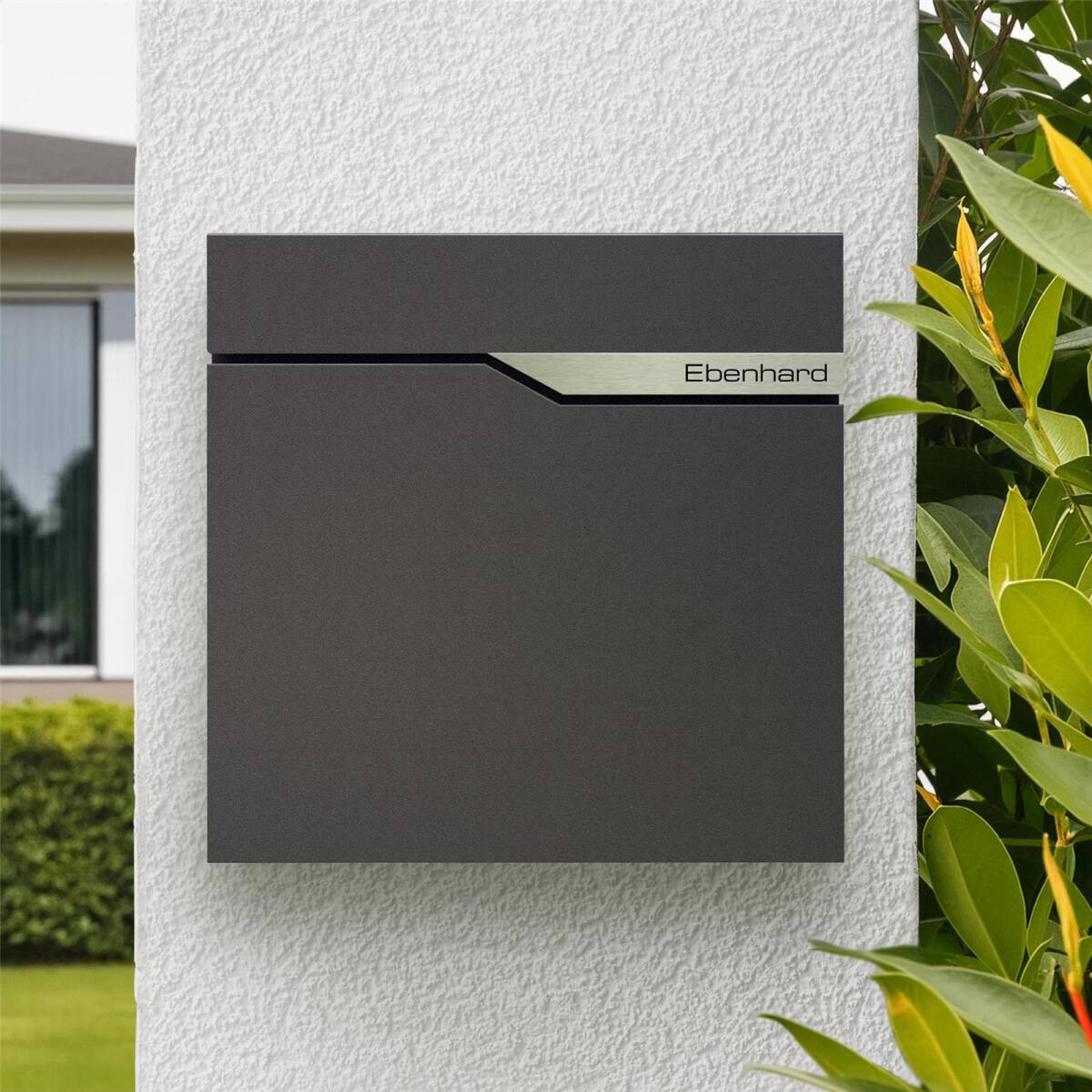 Eine Punktlandung auf ganzer Linie: Fertigung aus massivem Stahl und Pulverbeschichtung in mattem Anthrazitgrau, professionelle Lasergravur, optimale Funktionalität. Bringen Sie Ihren Eingangsbereich auf ein neues Level mit unserem Briefkasten "Ebenhard".