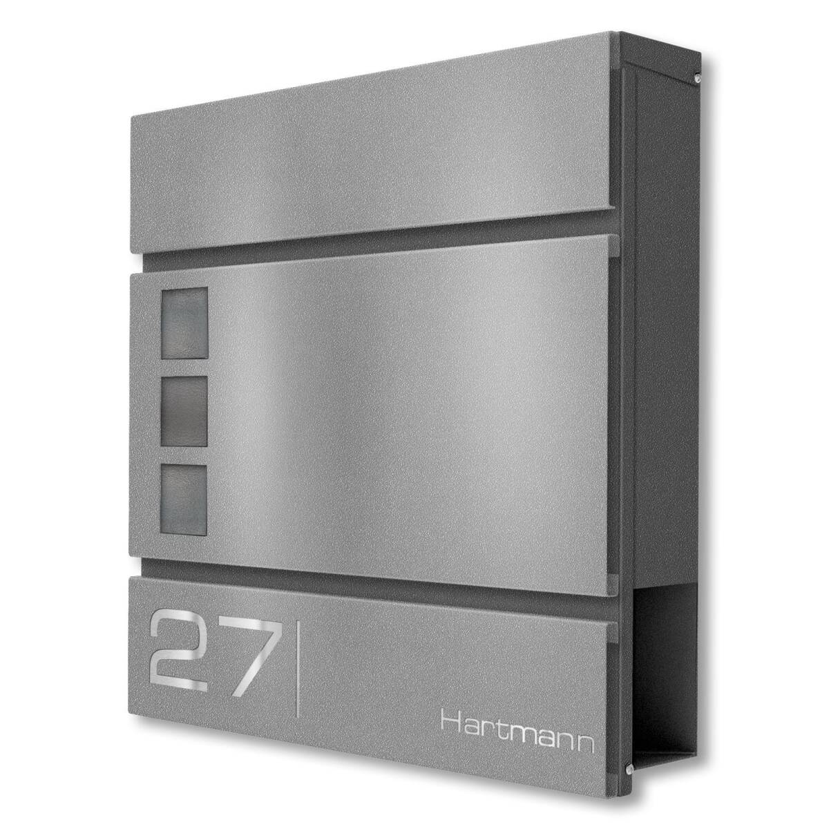 Der Briefkasten wird aus hochwertigem, massivem Stahl hergestellt. Um den Briefkasten noch witterungsbeständiger zu gestalten, wird der Stahl nach der Bearbeitung aufwendig in Graualuminium RAL 9007, Feinstruktur matt, pulverbeschichtet. So können dem Briefkasten weder Wind noch Wetter etwas anhaben. Als weiteres Highlight können Sie für die Gravur Ihres Namens und Hausnummer aus zahlreichen modernen Schriftarten wählen und so Ihrem Briefkasten einen individuellen Touch verleihen.