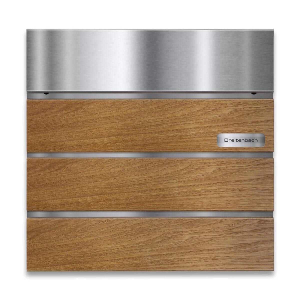 Der Korpus besteht aus rostfreiem Edelstahl, wodurch er äußerst witterungsbeständig und langlebig ist. Die Front des Briefkastens wird mit Holzoptik Eiche beschlagen – das verleiht ihm ein warmes und harmonisches Aussehen.