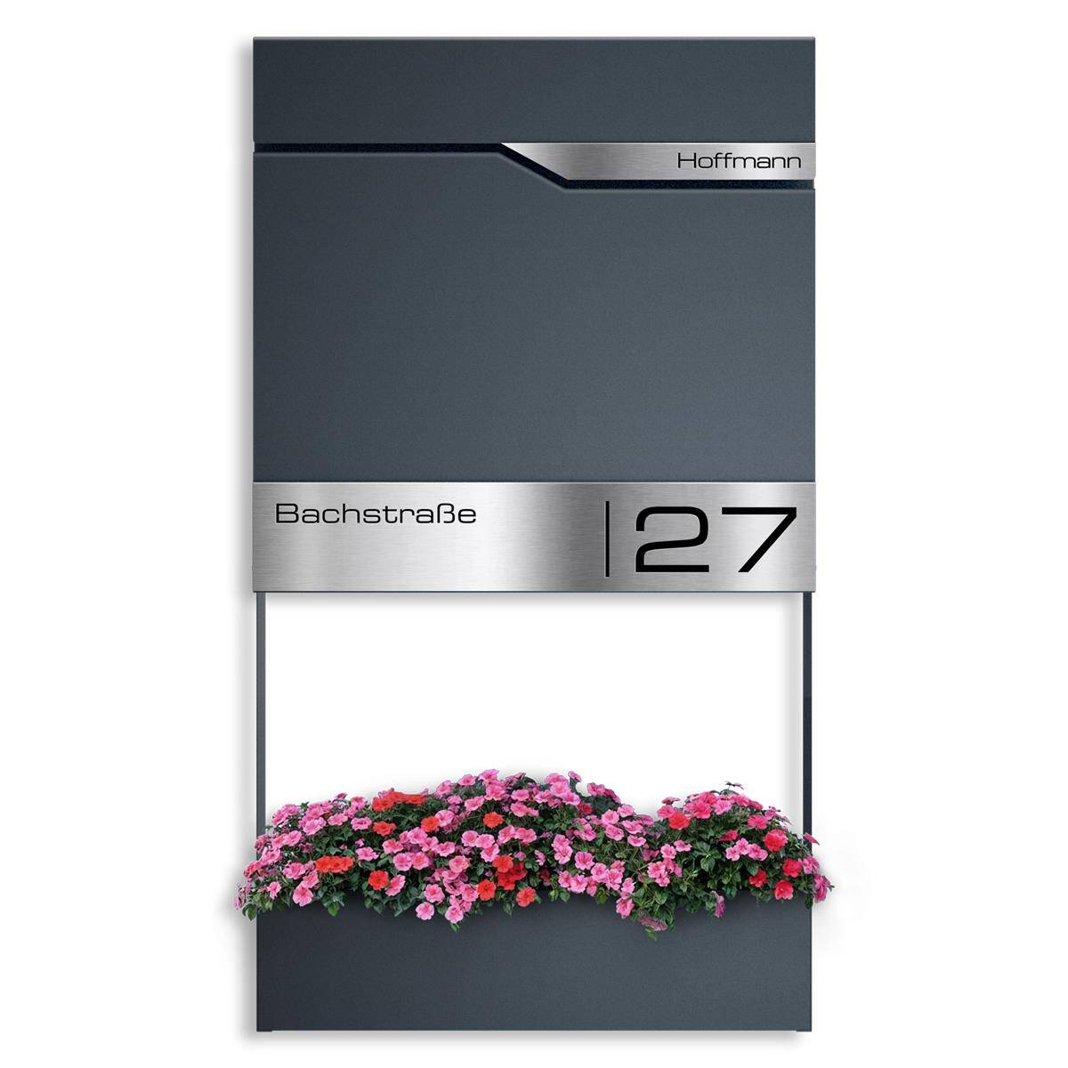 Der Briefkasten wird aus hochwertigem, massivem Stahl hergestellt. Um den Briefkasten noch witterungsbeständiger zu gestalten, wird der Stahl nach dem Laserschnitt von Straße und Hausnummer aufwendig in Anthrazit RAL 7016 pulverbeschichtet. So können dem Briefkasten weder Wind noch Wetter etwas anhaben. Der im Lieferumfang enthaltene Blumenkasten Frame J ergänzt das Design optimal und sorgt für ein modernes Gesamtbild.