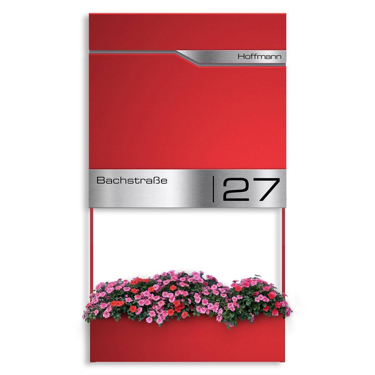 Der Briefkasten wird aus hochwertigem, massivem Stahl hergestellt. Um den Briefkasten noch witterungsbeständiger zu gestalten, wird der Stahl nach dem Laserschnitt von Straße und Hausnummer aufwendig in RAL 9007 Graualuminium pulverbeschichtet. So können dem Briefkasten weder Wind noch Wetter etwas anhaben. Der im Lieferumfang enthaltene Blumenkasten Frame J ergänzt das Design optimal und sorgt für ein modernes Gesamtbild.