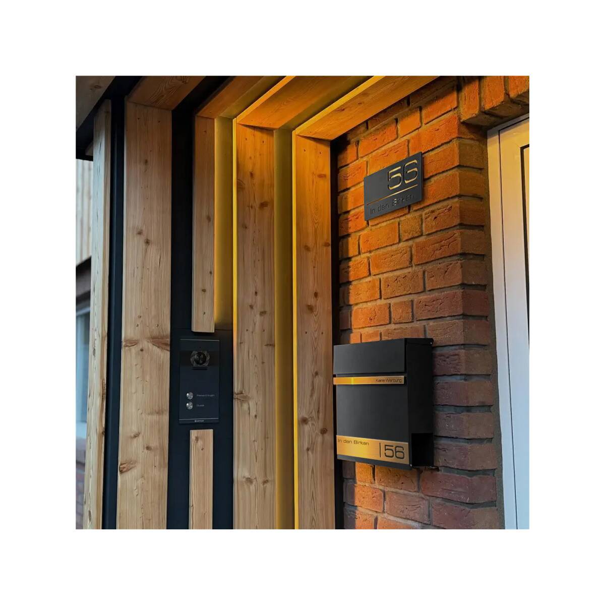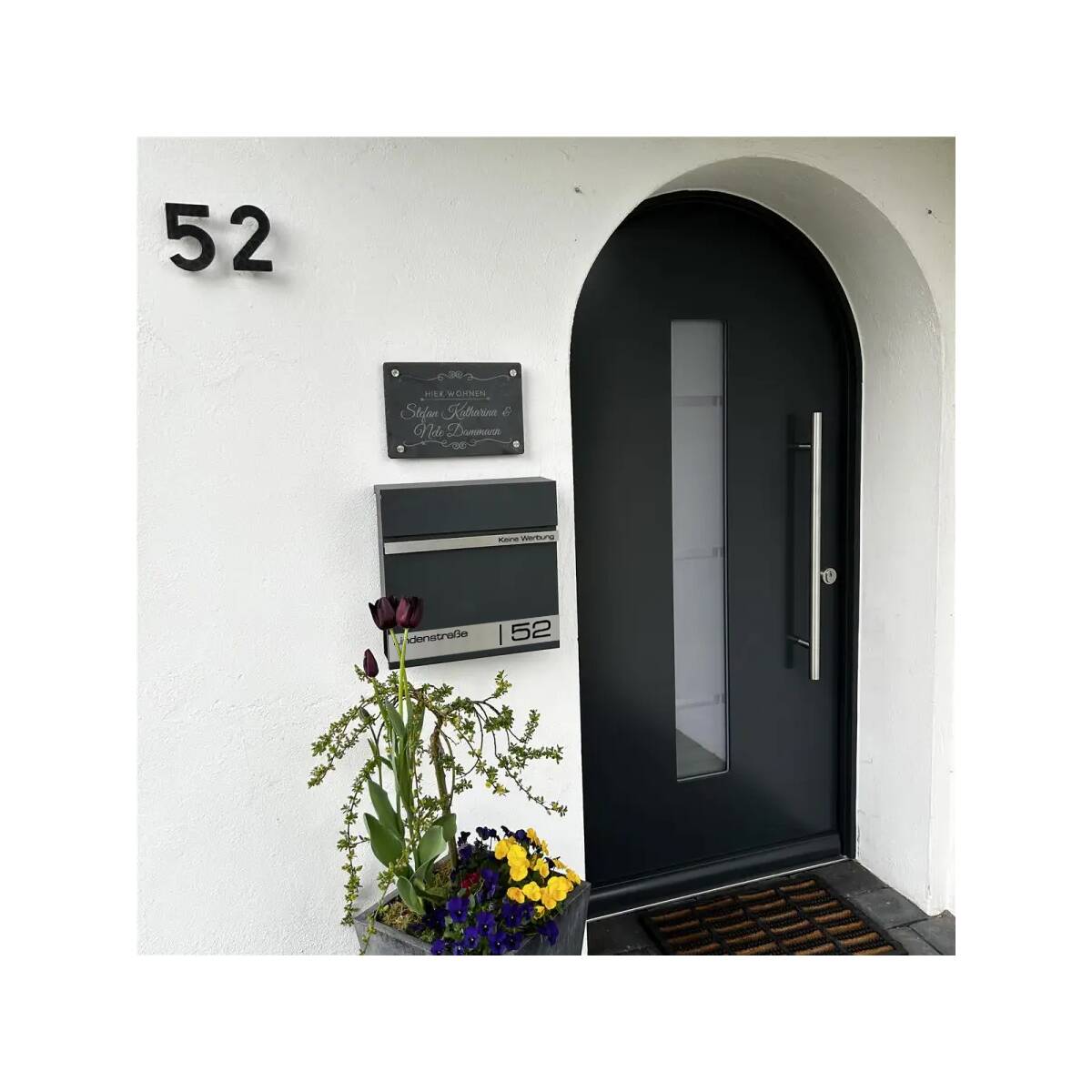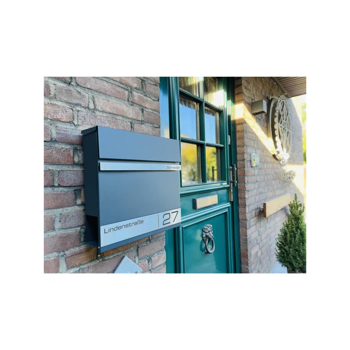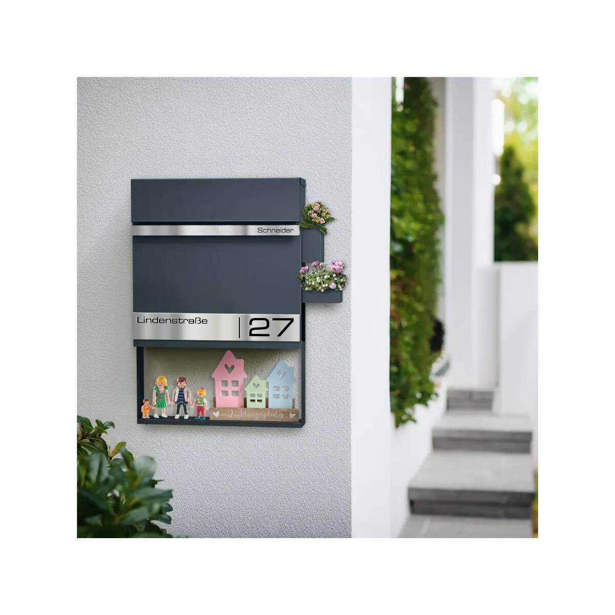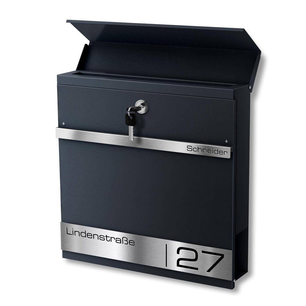 Als besonderes Highlight erhält der Briefkasten individuell personalisierbare Gravurleisten aus rostfreiem V4A Edelstahl, die Sie mit Ihrem Familiennamen und Ihrer Adresse Lasergravieren lassen können. Hierfür können Sie aus vielen modernen Schriftarten wählen und so Ihrem Briefkasten einen individuellen Touch verleihen.