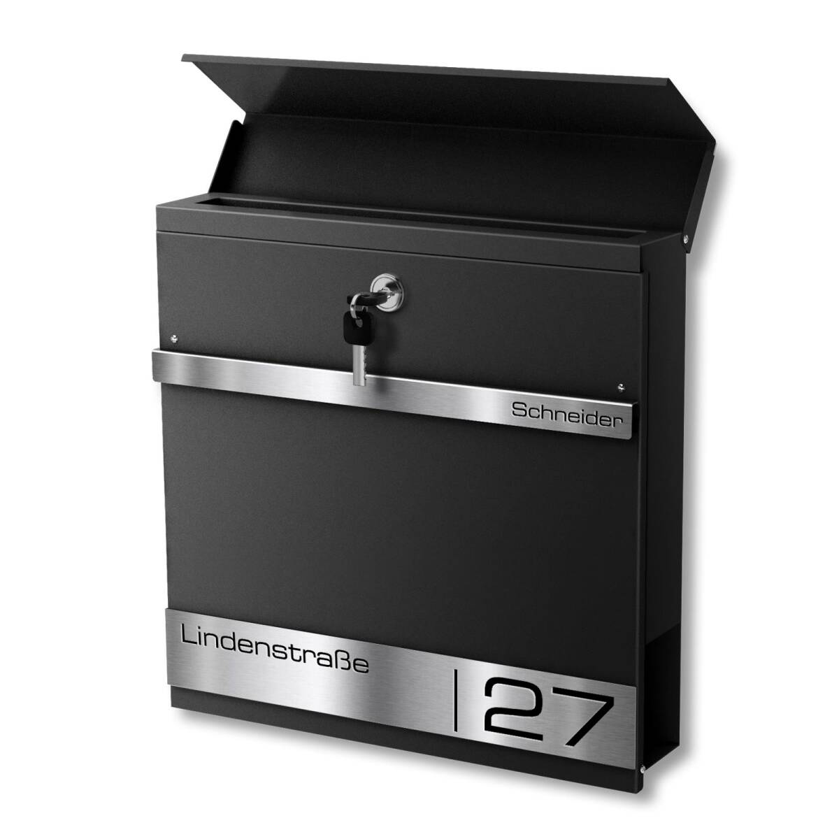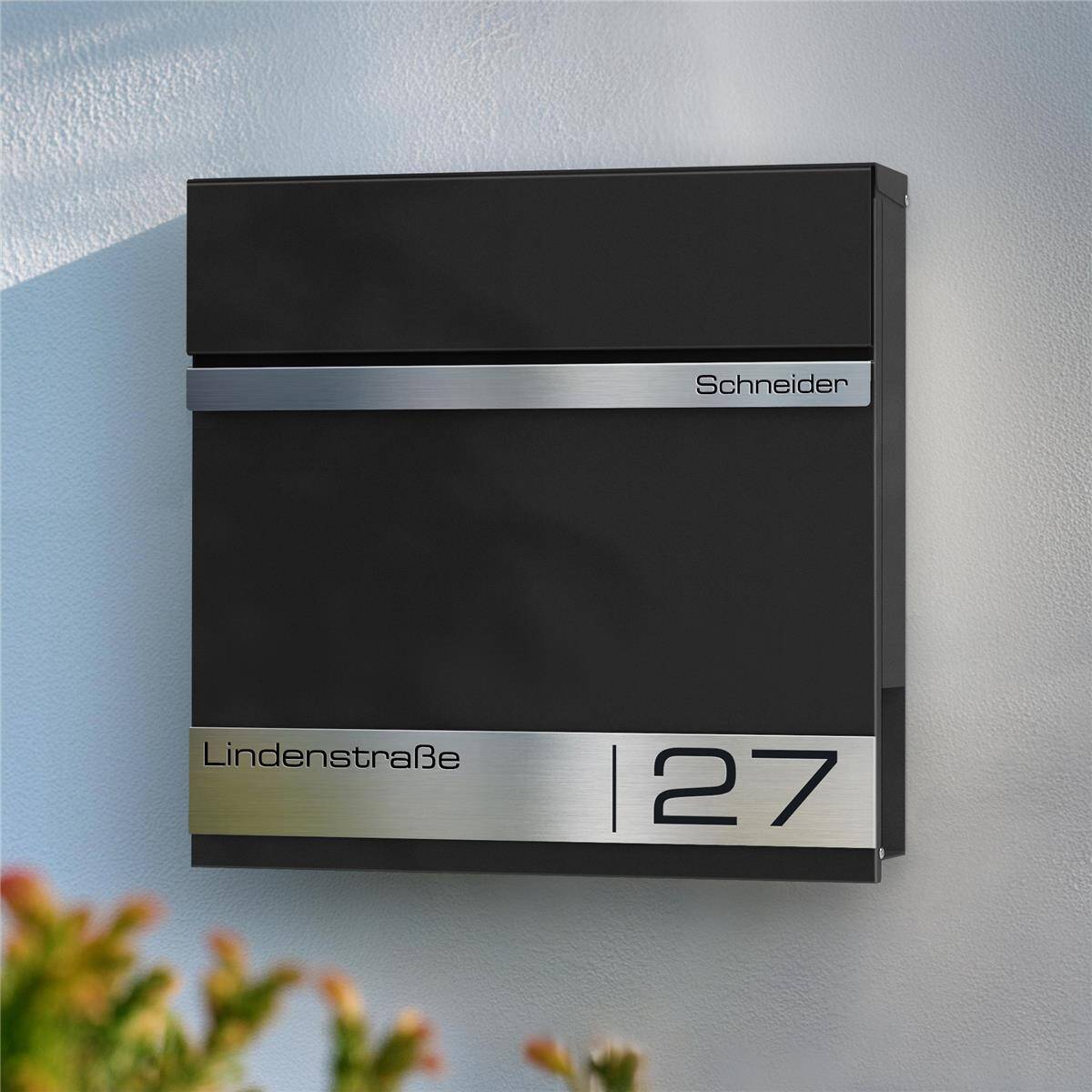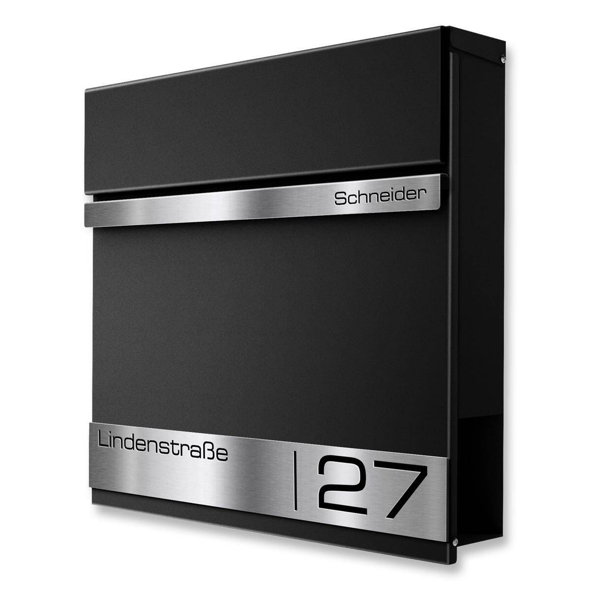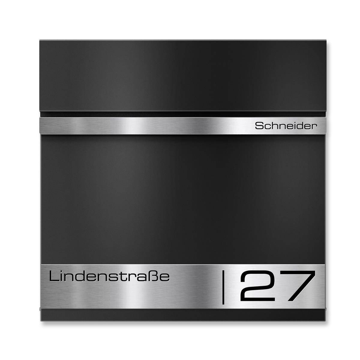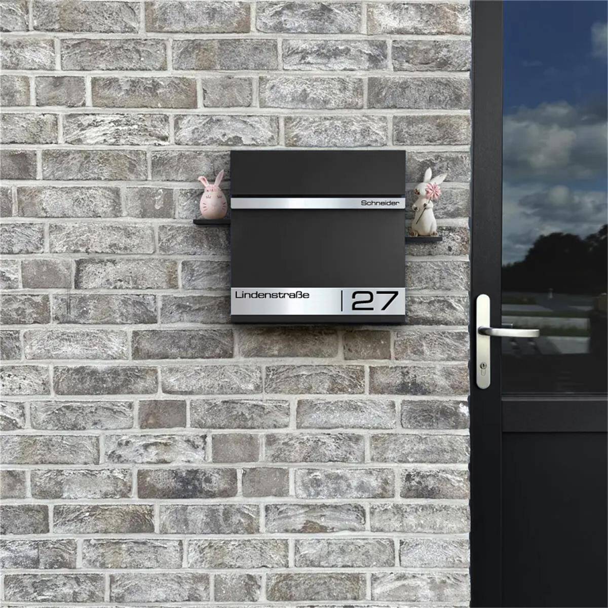Als besonderes Highlight erhält der Briefkasten individuell personalisierbare Gravurleisten aus rostfreiem V4A Edelstahl, die Sie mit Ihrem Familiennamen und Ihrer Adresse Lasergravieren lassen können. Hierfür können Sie aus vielen modernen Schriftarten wählen und so Ihrem Briefkasten einen individuellen Touch verleihen.