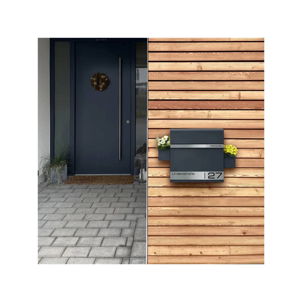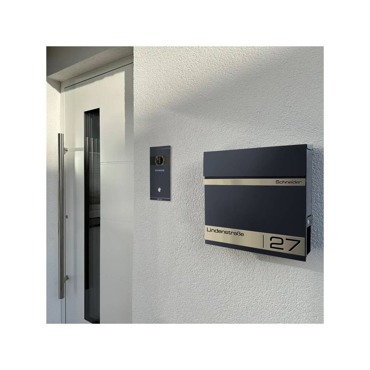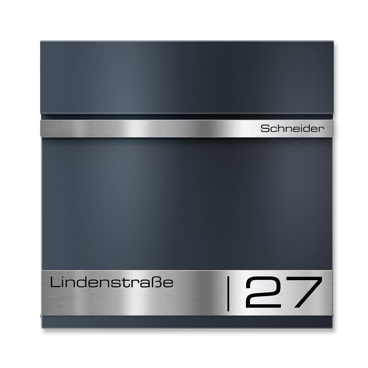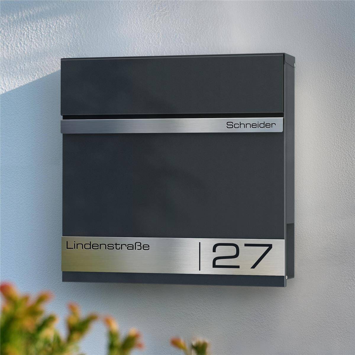 Als besonderes Highlight erhält der Briefkasten individuell personalisierbare Gravurleisten aus rostfreiem V4A Edelstahl, die Sie mit Ihrem Familiennamen und Ihrer Adresse Lasergravieren lassen können. Hierfür können Sie aus vielen modernen Schriftarten wählen und so Ihrem Briefkasten einen individuellen Touch verleihen.