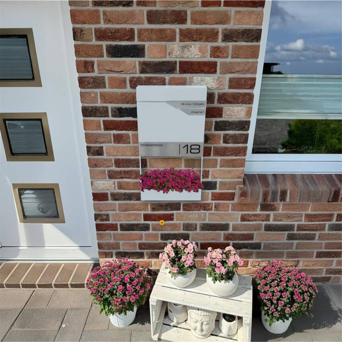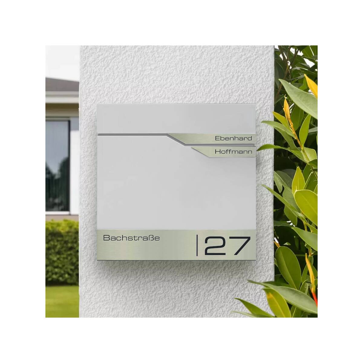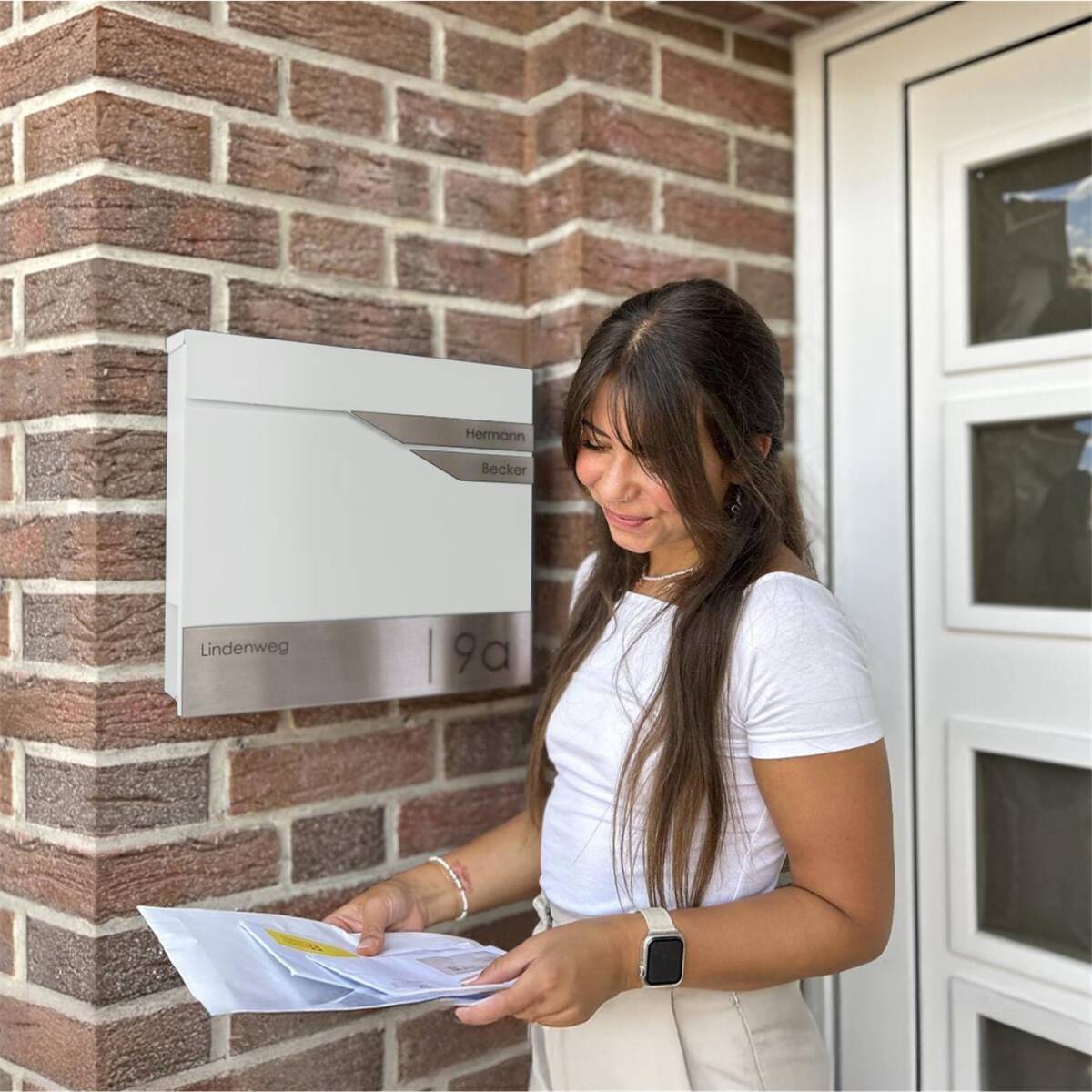Besonders die Gravurleisten aus rostfreiem Edelstahl stechen bei diesem Briefkastenmodell hervor. Auf den zwei oberen, selbstklebenden Schildern können Sie Ihre Namen eingravieren lassen. Die untere Edelstahlblende kann mit dem Straßennamen und der Hausnummer versehen werden. Hierfür können Sie zwischen ausgewählten Schriftarten wählen und so Ihrem Briefkasten einen individuellen Touch verleihen.