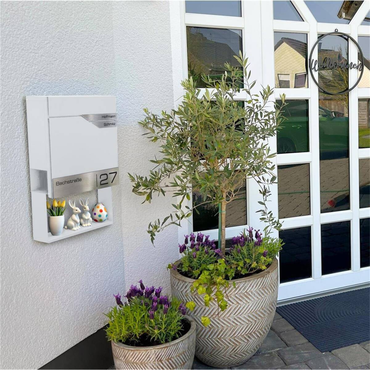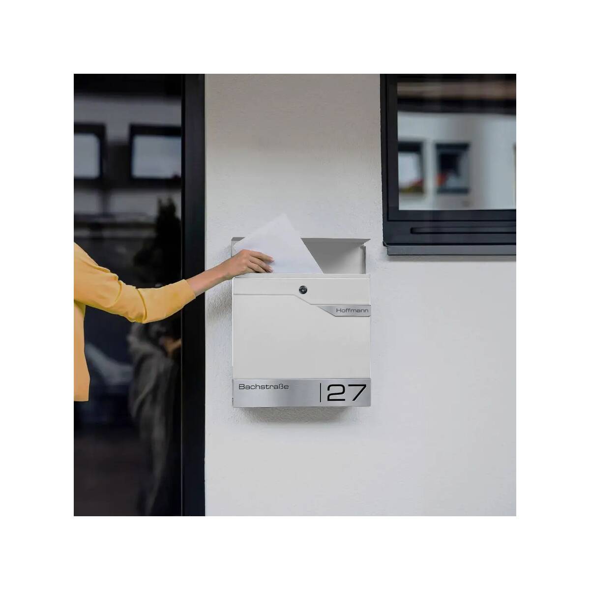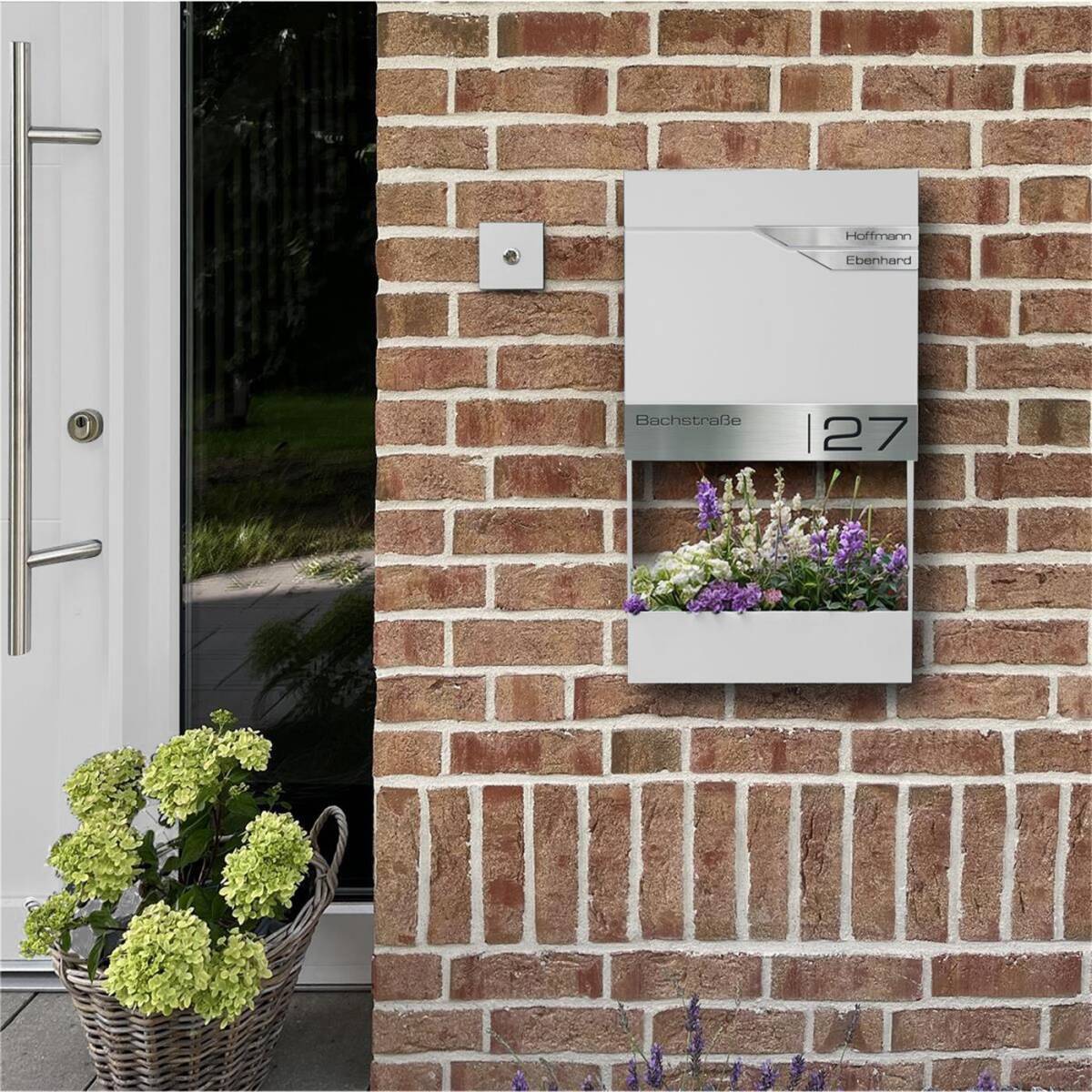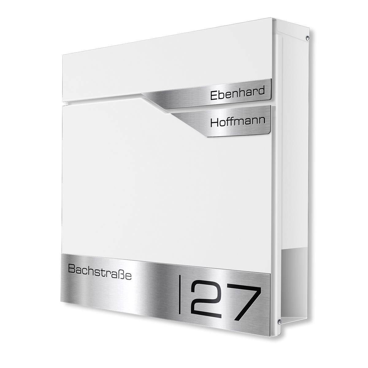 Besonders die Gravurleisten aus rostfreiem Edelstahl stechen bei diesem Briefkastenmodell hervor. Auf den zwei oberen, selbstklebenden Schildern können Sie Ihre Namen eingravieren lassen. Die untere Edelstahlblende kann mit dem Straßennamen und der Hausnummer versehen werden. Hierfür können Sie zwischen ausgewählten Schriftarten wählen und so Ihrem Briefkasten einen individuellen Touch verleihen.