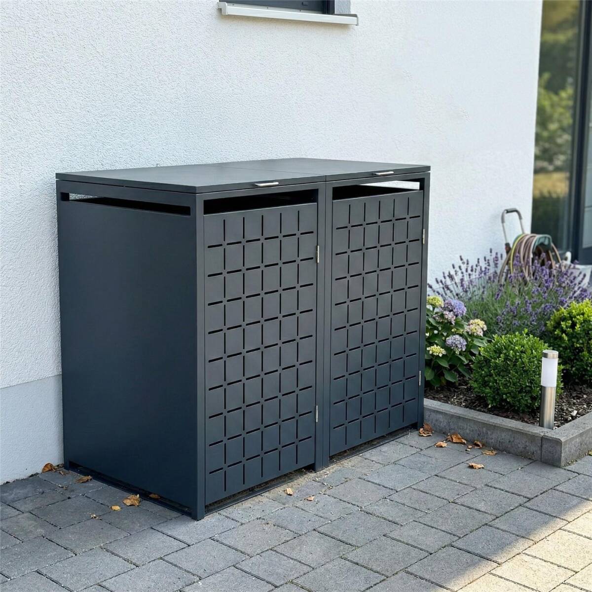 Pour garantir la durée de vie de nos caches-poubelles, nous chez Metzler utilisons un acier galvanisé, connu de l’industrie automobile. Il est additionnellement revêtu en poudre en RAL 7016 gris anthracite. Ceci crée non seulement une allure moderne et unehaptique confortable, mais protège également les caches-poubelles contre des influences des intempéries comme des rayons UV, la pluie et la neige.
