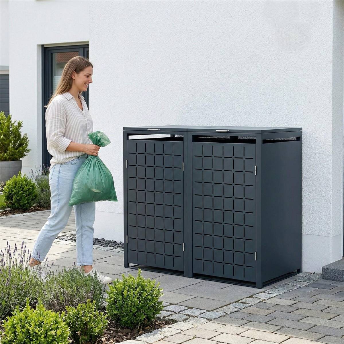 Metzler cache-poubelles en acier revêtu en poudre résistant aux intempéries avec couvercle automatique pratique pour 2 poubelles à volume de 60-240 litres